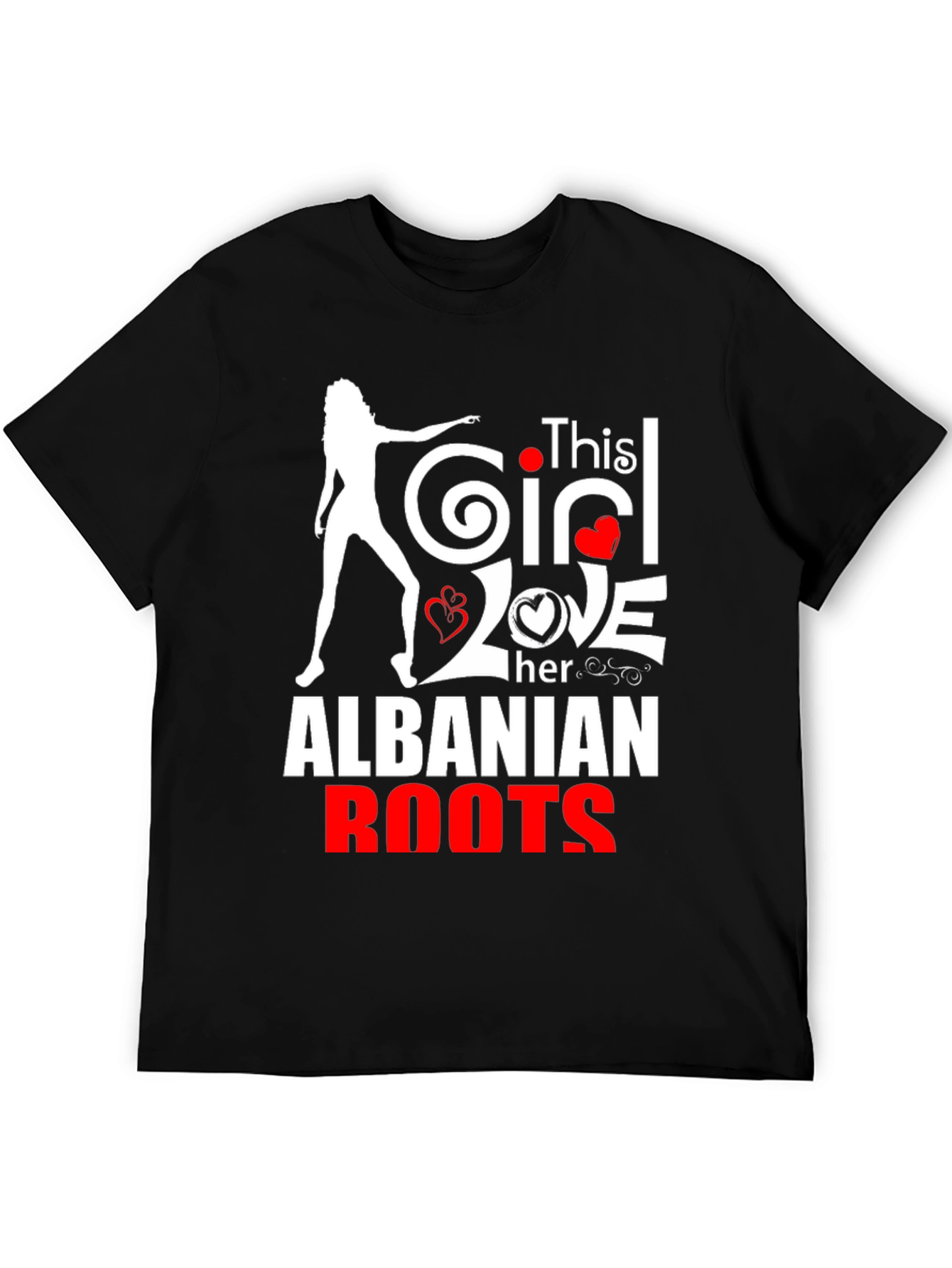 Showcase your Albanian pride with this stylish graphic tee! The black t-shirt features a bold design with a silhouette of a girl and the phrase "This Girl Love her ALBANIAN ROOTS." The design is printed in white and red, creating a striking contrast. Made from a comfortable material, this tee is perfect for casual wear. Whether you're celebrating your heritage, or simply love unique graphic tees, this is a great addition to your wardrobe. It's a perfect conversation starter and a fantastic way to express your identity with pride!