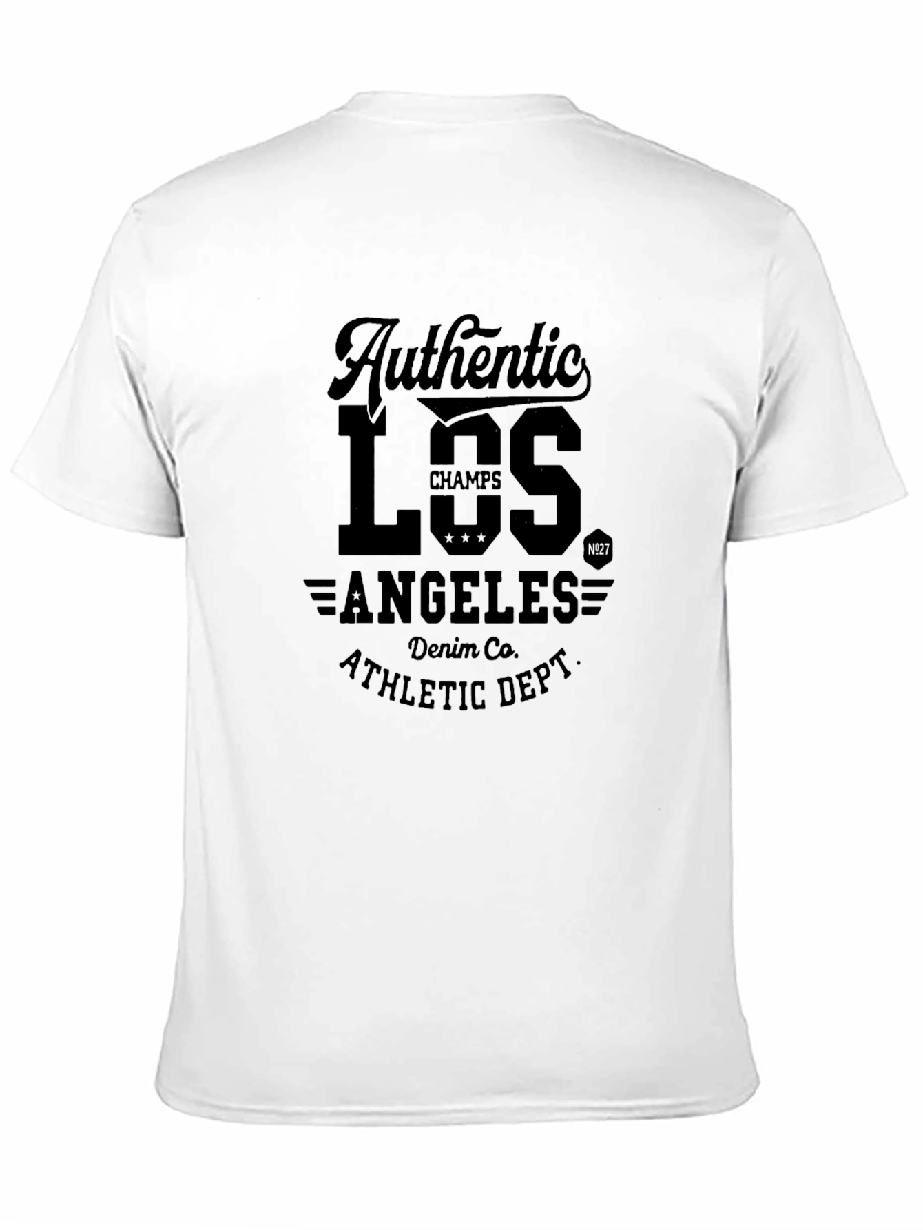 Show your love for Los Angeles with this stylish black graphic tee. The shirt features a vintage-inspired design with "Authentic" scripted above "LOS" and "ANGELES" stacked below, with stars in between. The text is printed in a distressed black font, giving it a cool, worn look. Made from a soft and breathable fabric, this t-shirt is perfect for casual outings, sports events, or everyday wear. It's a great way to represent your city and your love for a classic, comfortable tee.