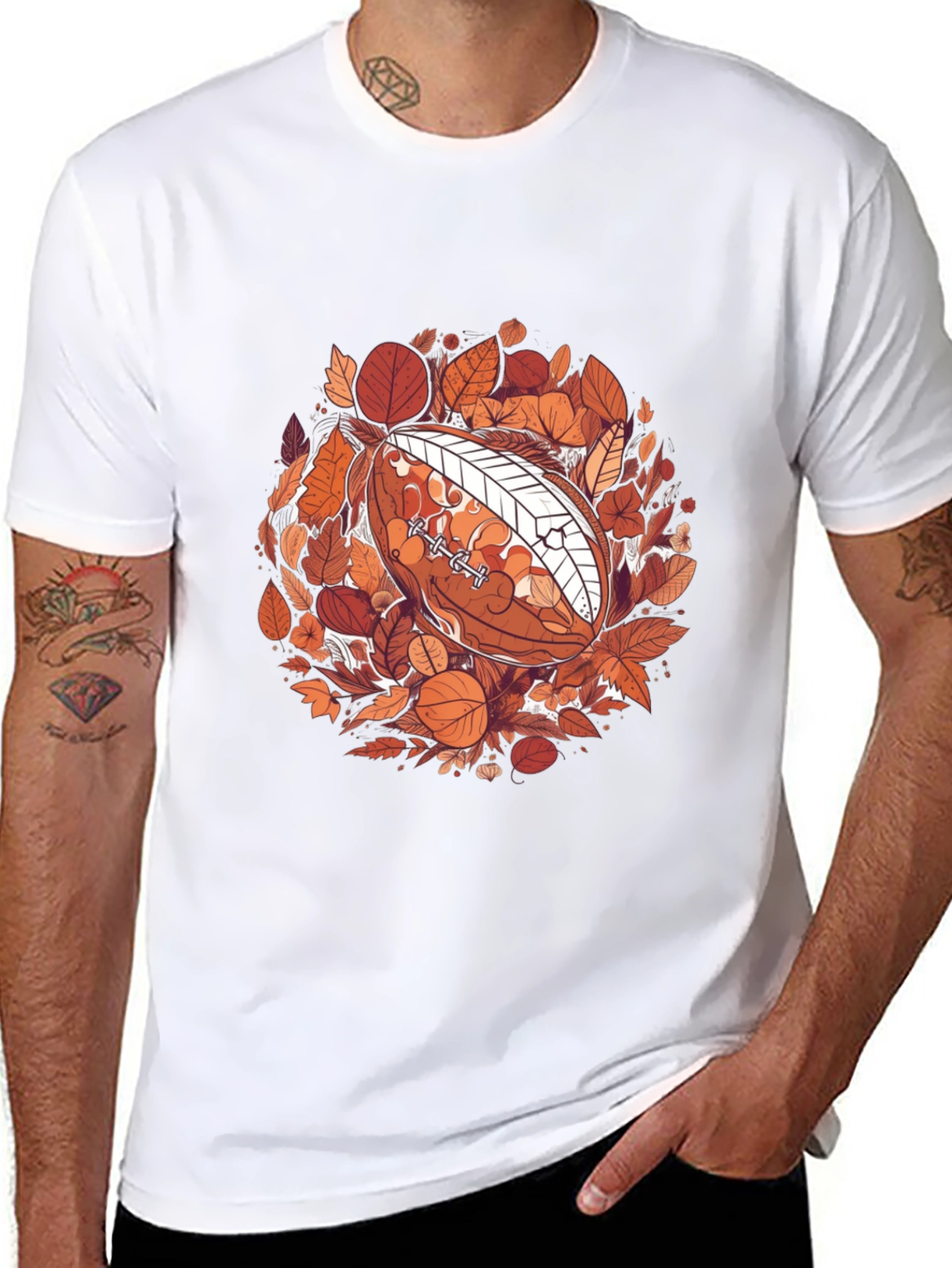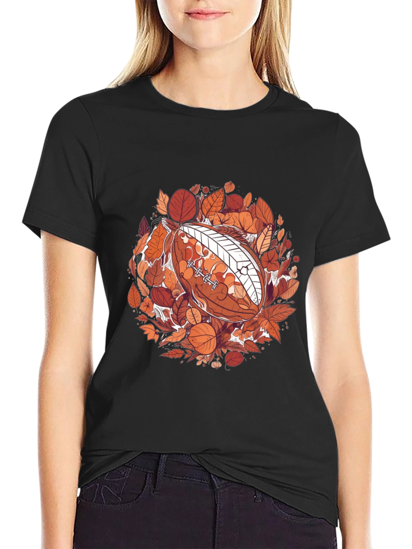 Show your love for football and fall with this unique graphic tee. This black t-shirt features a football surrounded by colorful autumn leaves. The intricate design pops against the dark background, making it a stylish choice for casual wear. Made from a soft, comfortable fabric, this tee is perfect for game days, tailgating, or everyday outings. A great way to express your passion for the sport and the season.