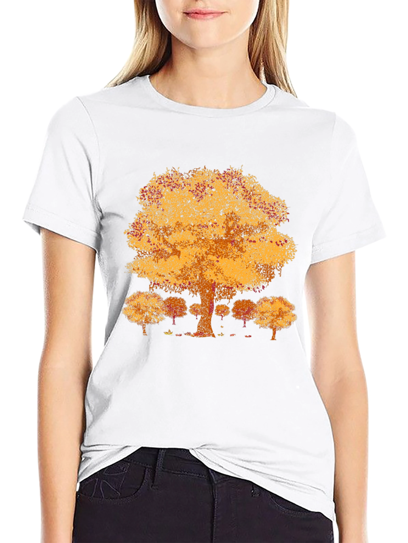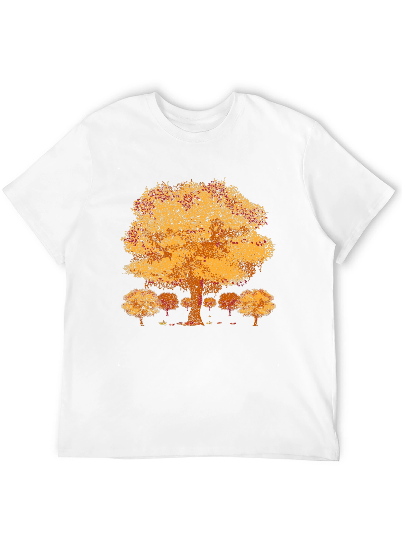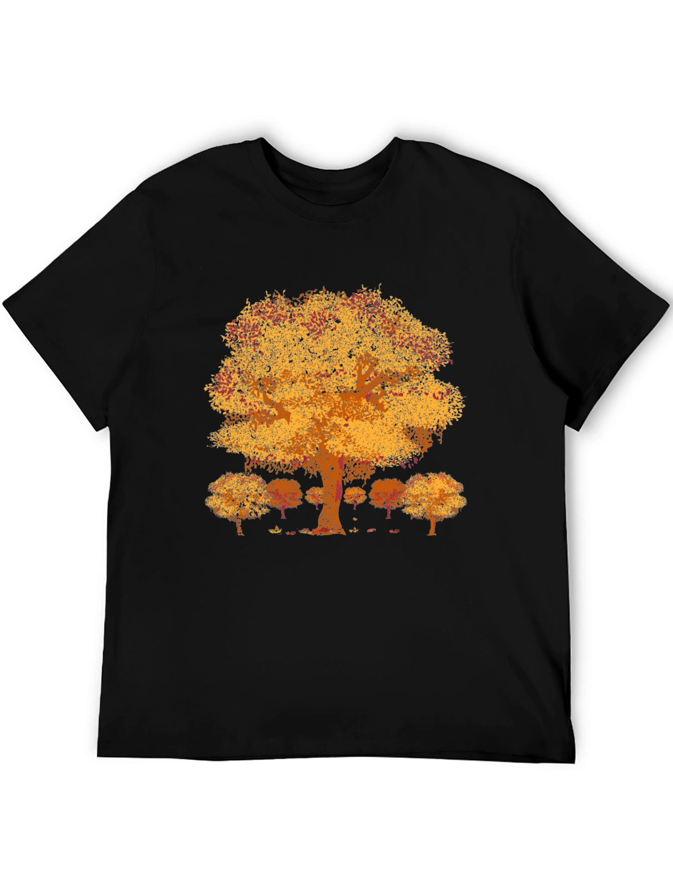 Embrace the beauty of autumn with this stylish black t-shirt. This unique tee features a vibrant graphic of a large tree with golden leaves, reminiscent of a fall foliage. Smaller trees create a background. The design is printed on a comfortable crew neck shirt, perfect for casual wear. Its eye-catching nature-inspired design makes it a standout piece, ideal for everyday style, outdoor adventures, or simply expressing your love for the autumn season. This tee offers both style and comfort. Get yours today!