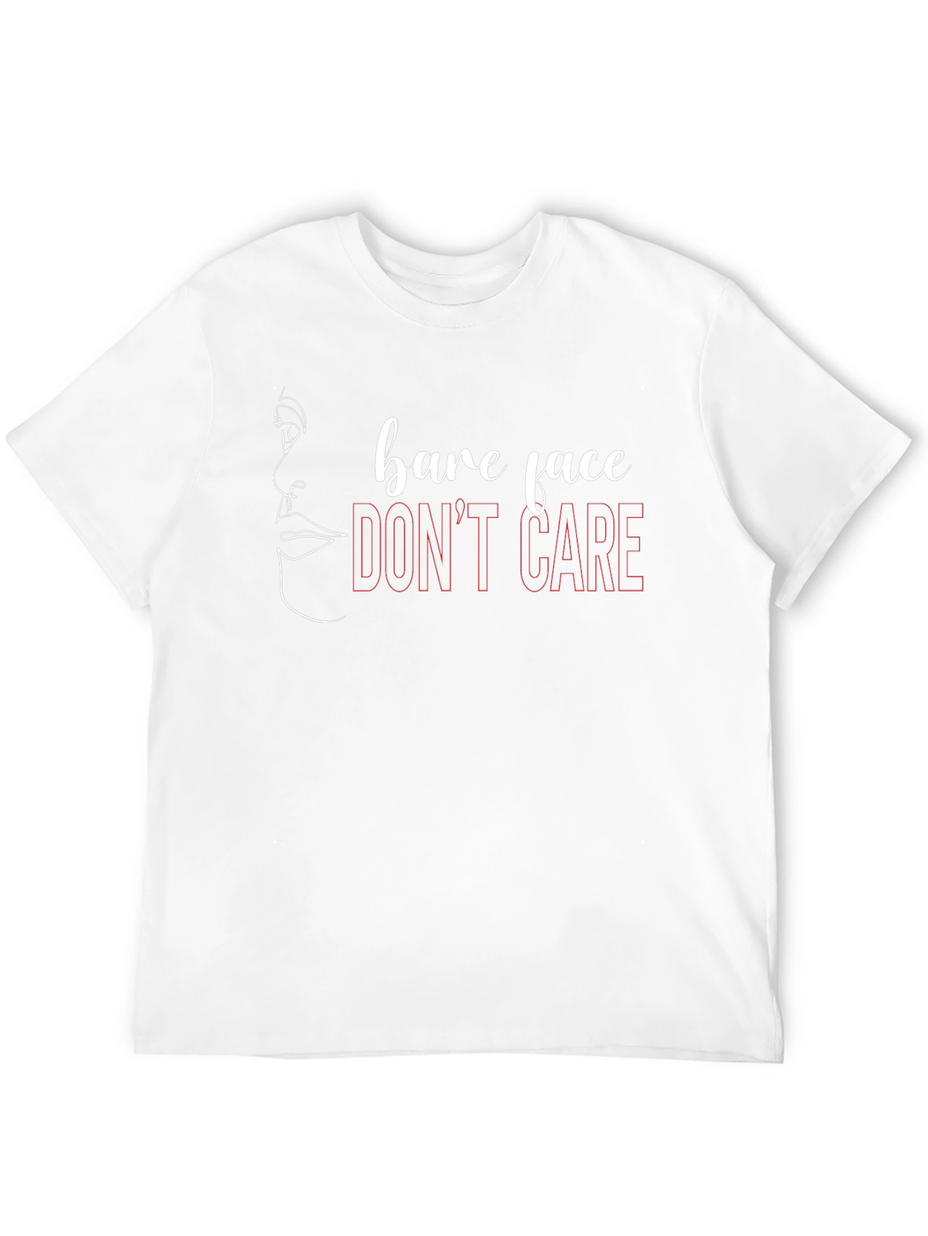 This classic black t-shirt makes a statement with its unique design. The minimalist line art of a face profile pairs with the sassy slogan 'bare face DON'T CARE' in a mix of white script and red block letters. The soft, comfortable fabric ensures all-day wearability, while the relaxed fit provides a casual and stylish look. Perfect for expressing your confident, carefree attitude, whether you're out running errands or relaxing with friends. This tee is a must-have for those who embrace their natural beauty and aren't afraid to show it. Grab yours now and let your tee do the talking!