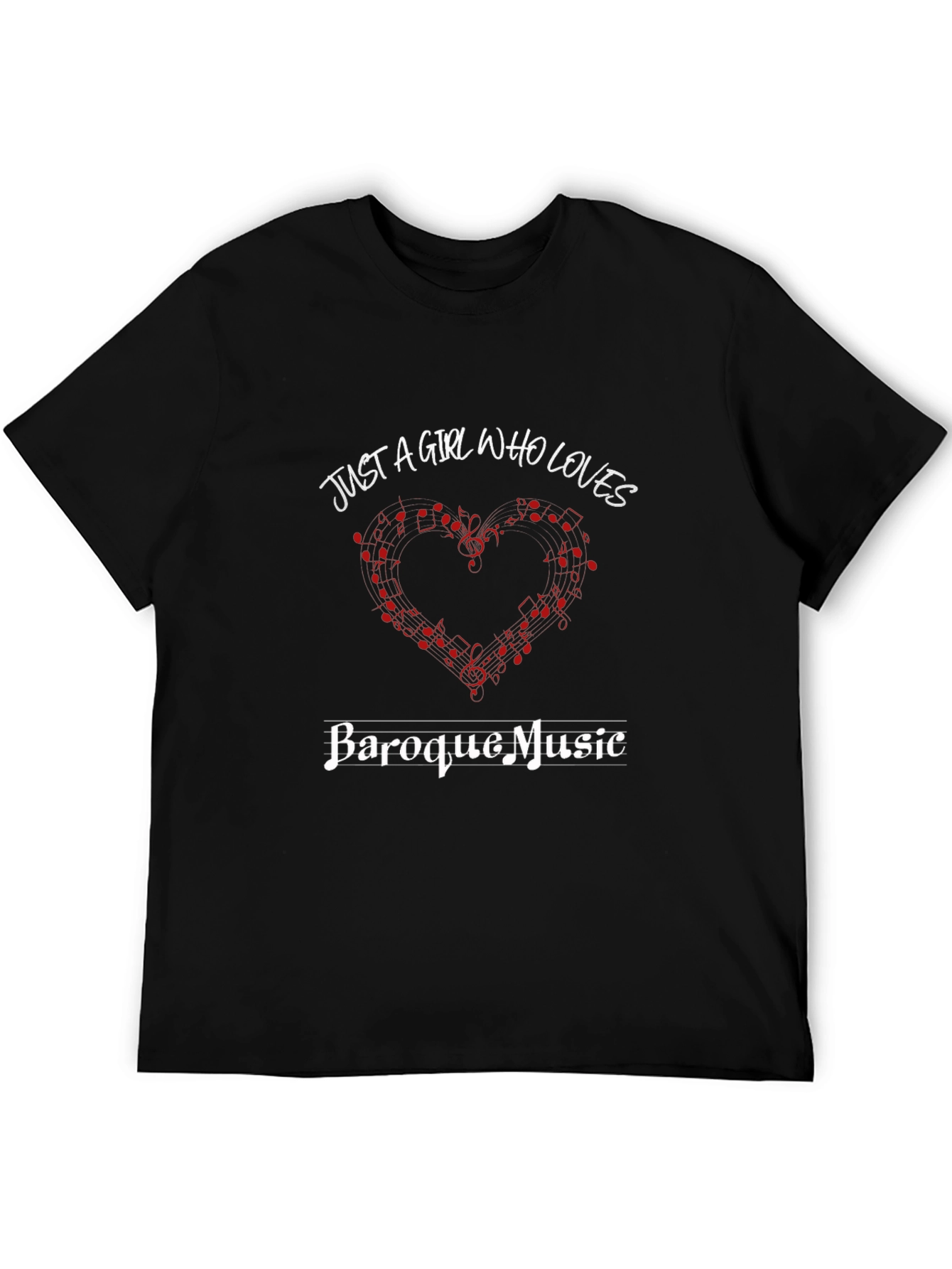 Show your love for Baroque music with this stylish black t-shirt! Featuring a charming design with the phrase 'Just a girl who loves' above a heart shape made of musical notes, and the words 'Baroque Music' below. Made from comfortable material, this shirt is perfect for casual wear, music events, or as a thoughtful gift for the Baroque enthusiast in your life. Make a statement and express your passion for classical music with this unique and eye-catching tee.