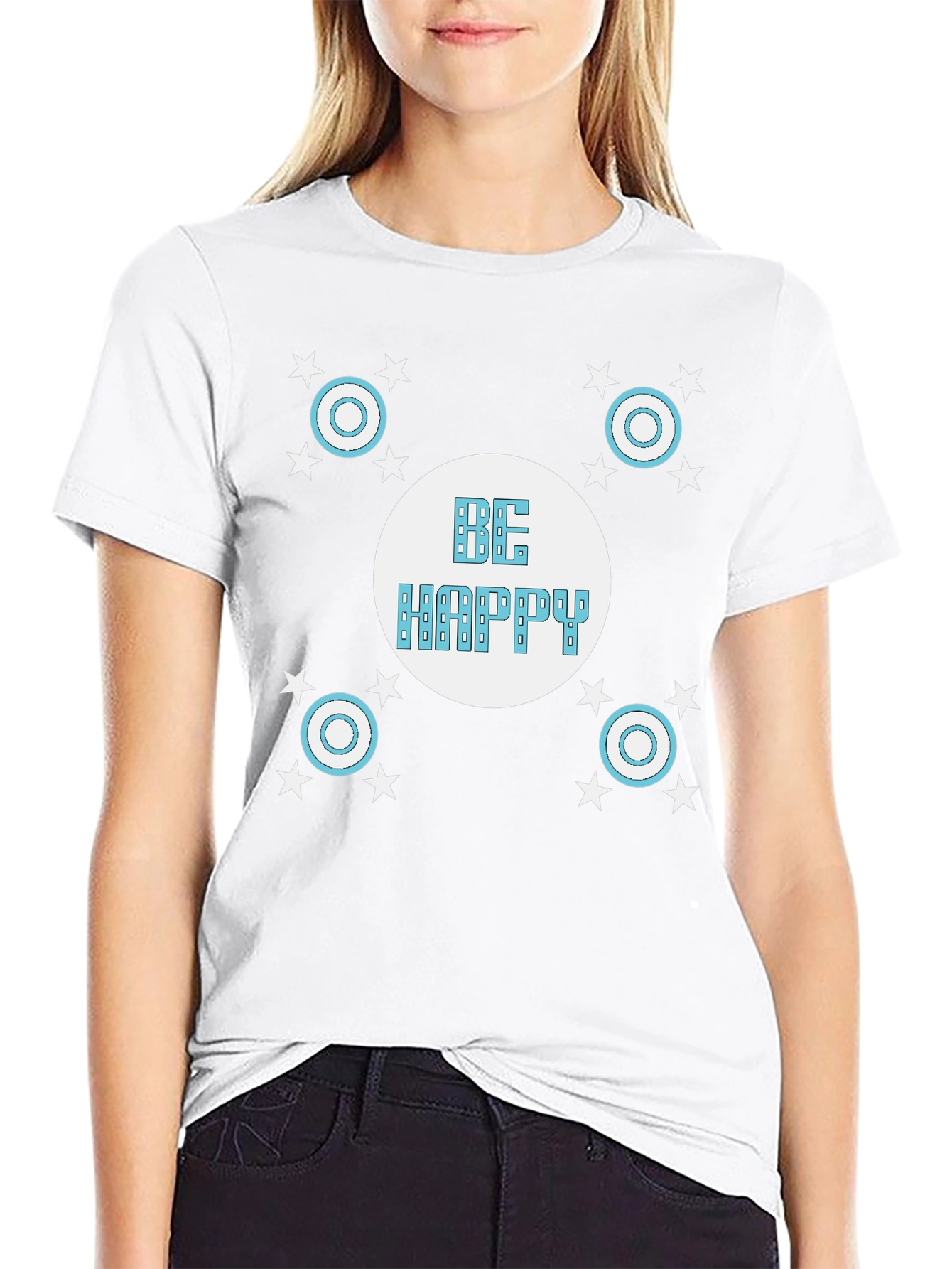 Spread positivity with this stylish black graphic t-shirt. The shirt features a unique design of four blue circle starbursts surrounding a center circle with the words “Be Happy” in a vintage block font. Made from comfortable fabric, this tee is perfect for everyday wear. The design offers a unique look that will be sure to get you compliments. Wear it to the gym, on casual outings, or just while relaxing at home. Let your clothing broadcast your cheery attitude!