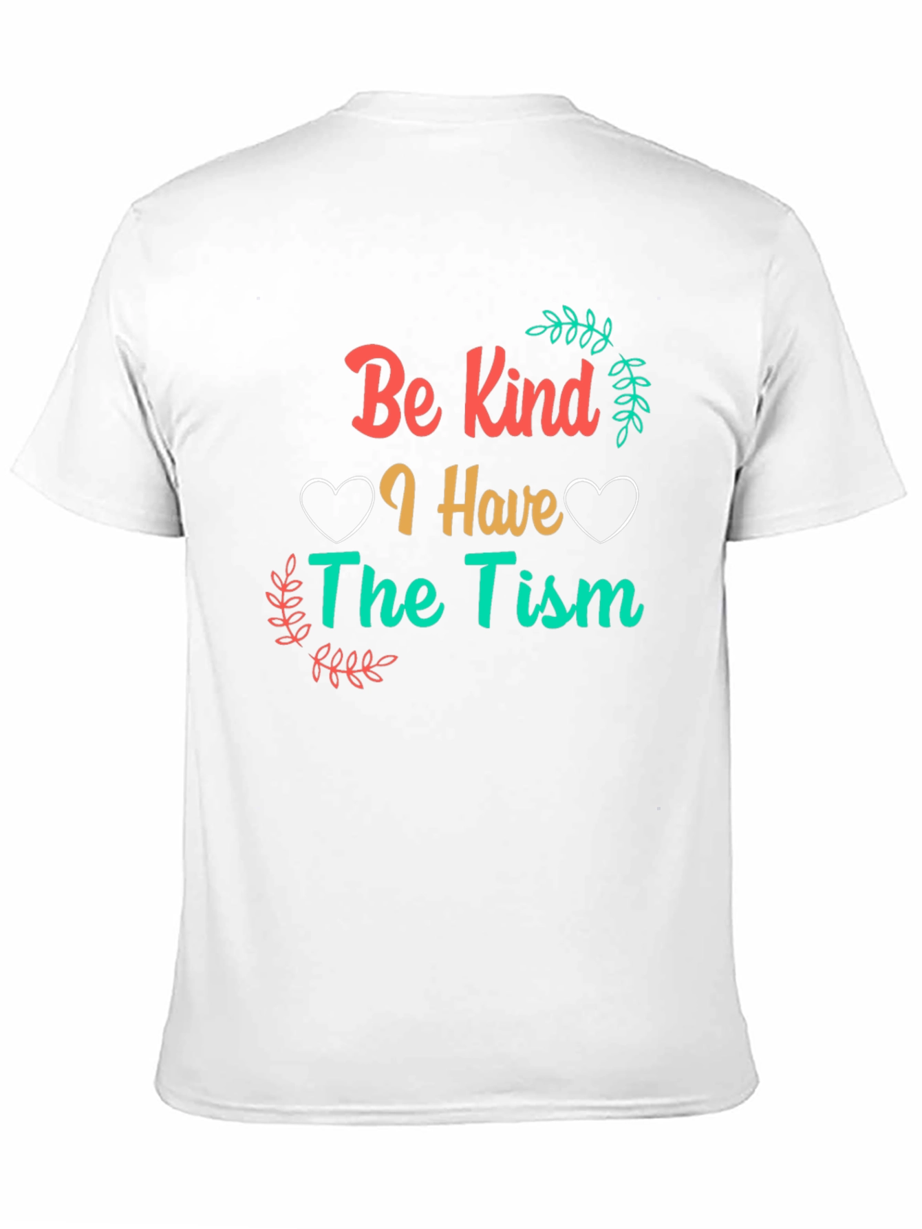 Show your support with this stylish "Be Kind I Have The Tism" t-shirt. The design features the phrase “Be Kind” in a coral hue, followed by a golden “I Have” between white heart shapes, and “The Tism” in teal. The design is embellished with green and coral sprigs. Made from a comfortable-looking black fabric, this shirt is perfect for everyday wear and raising awareness. It’s a great way to show your support and start conversations. Ideal for autism awareness events, casual outings, or as a thoughtful gift.
