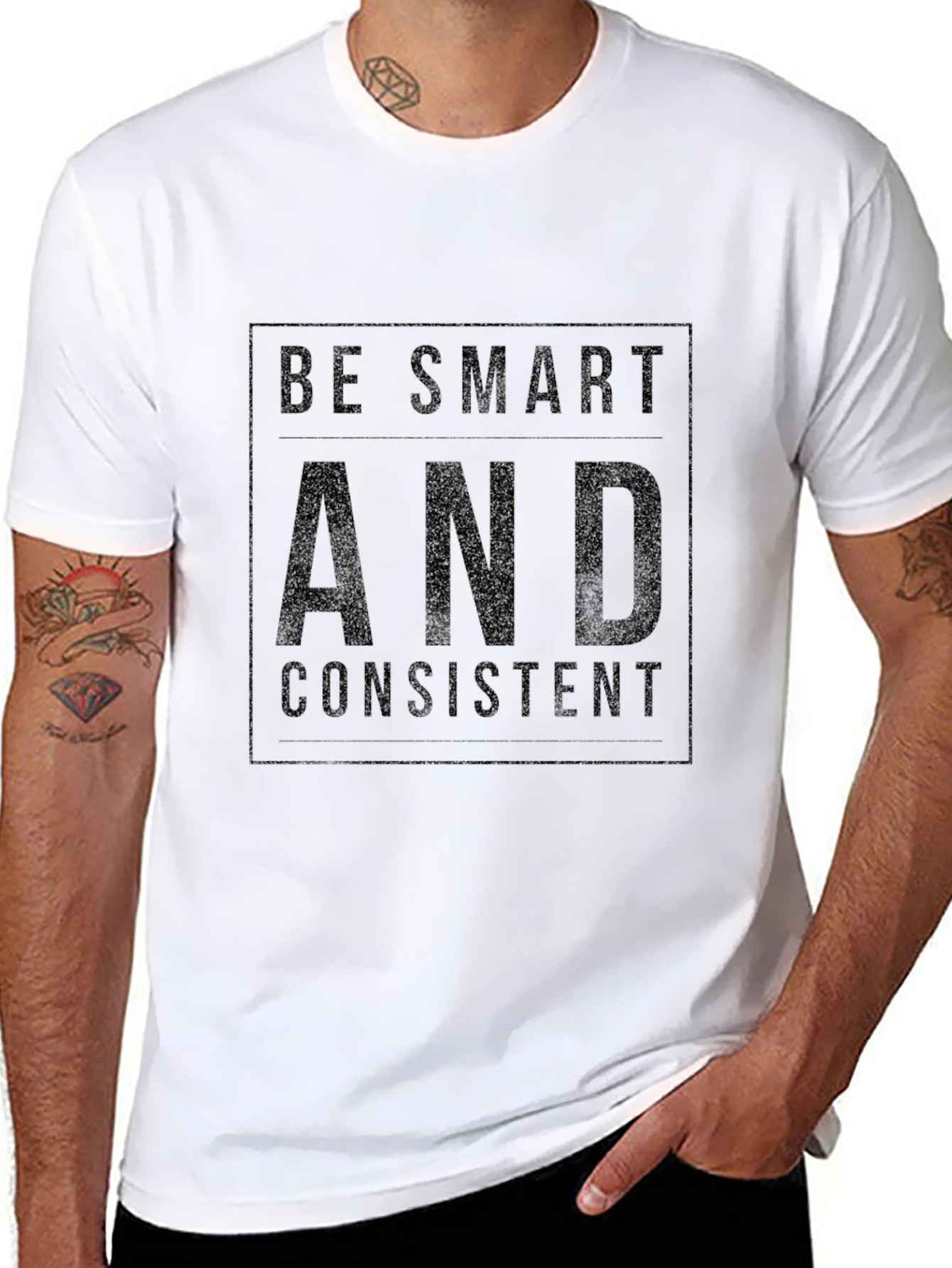 Elevate your casual style with this bold black T-shirt. Featuring the inspiring message 'Be Smart and Consistent' in a striking design, this tee is perfect for those who value both intellect and persistence. The shirt appears to be made from soft and breathable material, ensuring all-day comfort. Ideal for everyday wear, workouts, or casual outings, this versatile T-shirt pairs effortlessly with jeans, shorts, or joggers. Show off your commitment to personal growth and inspire those around you with this eye-catching tee. Grab yours today and make a statement!