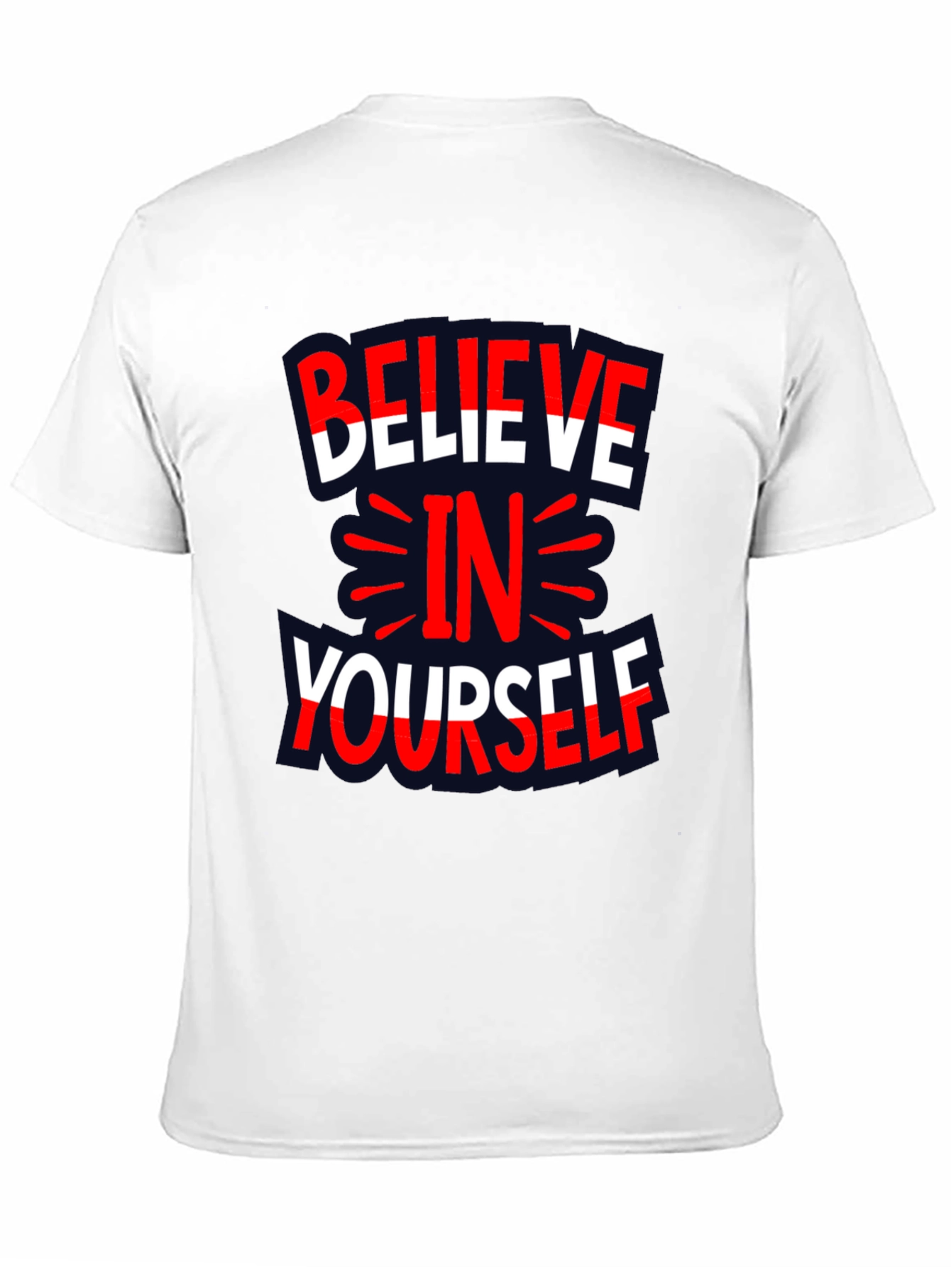 Showcase your positivity with this stylish black T-shirt featuring a bold "Believe in Yourself" graphic. The eye-catching design uses red and white text with a unique, stylized font. Made from comfortable, breathable fabric, this tee is perfect for everyday wear, workouts, or casual outings. The vibrant print adds a pop of color to any outfit, making it a standout piece in your wardrobe. Express your self-confidence and inspire those around you with this motivational and fashionable T-shirt. It’s a great conversation starter and a reminder to always believe in yourself!