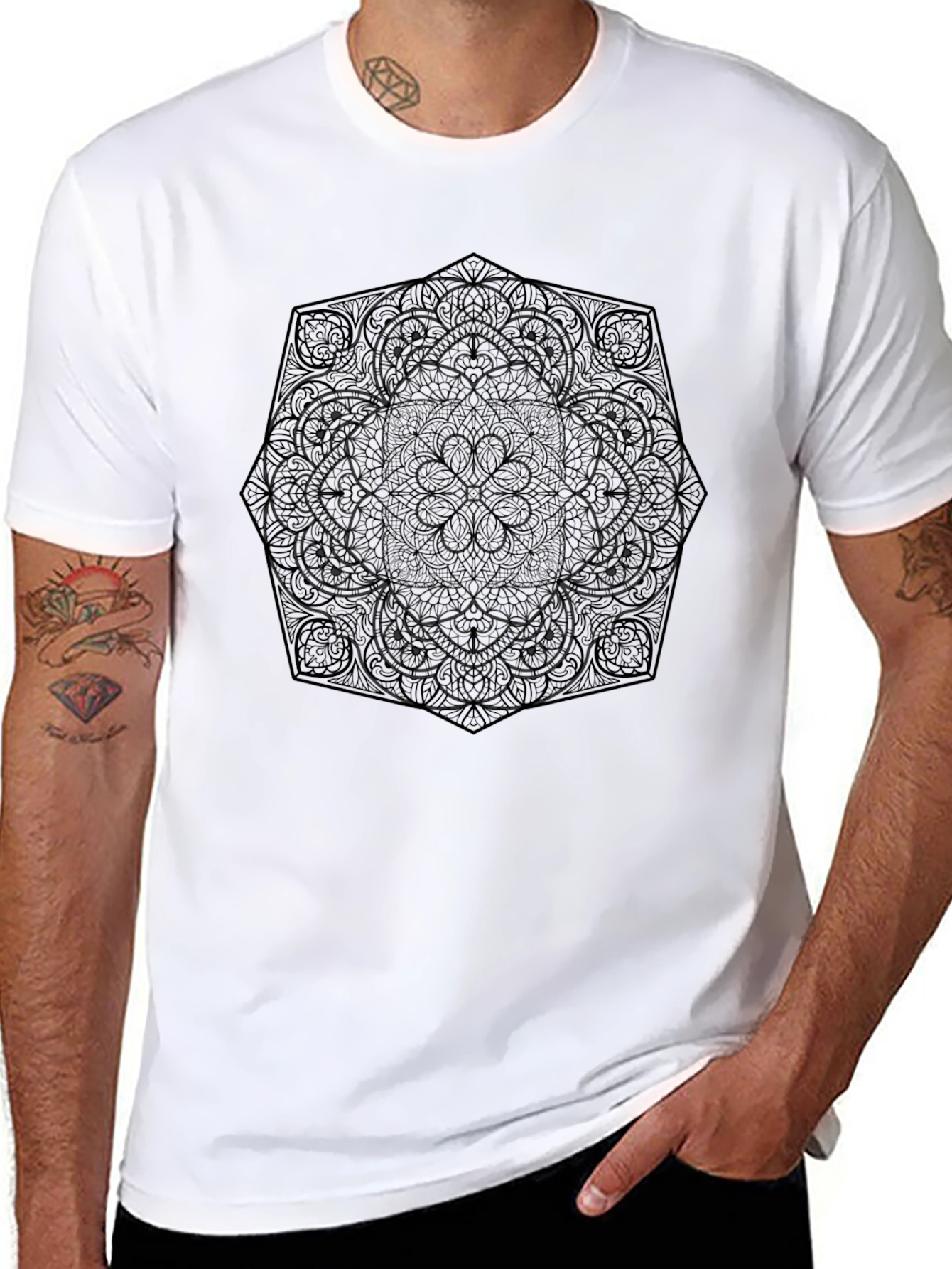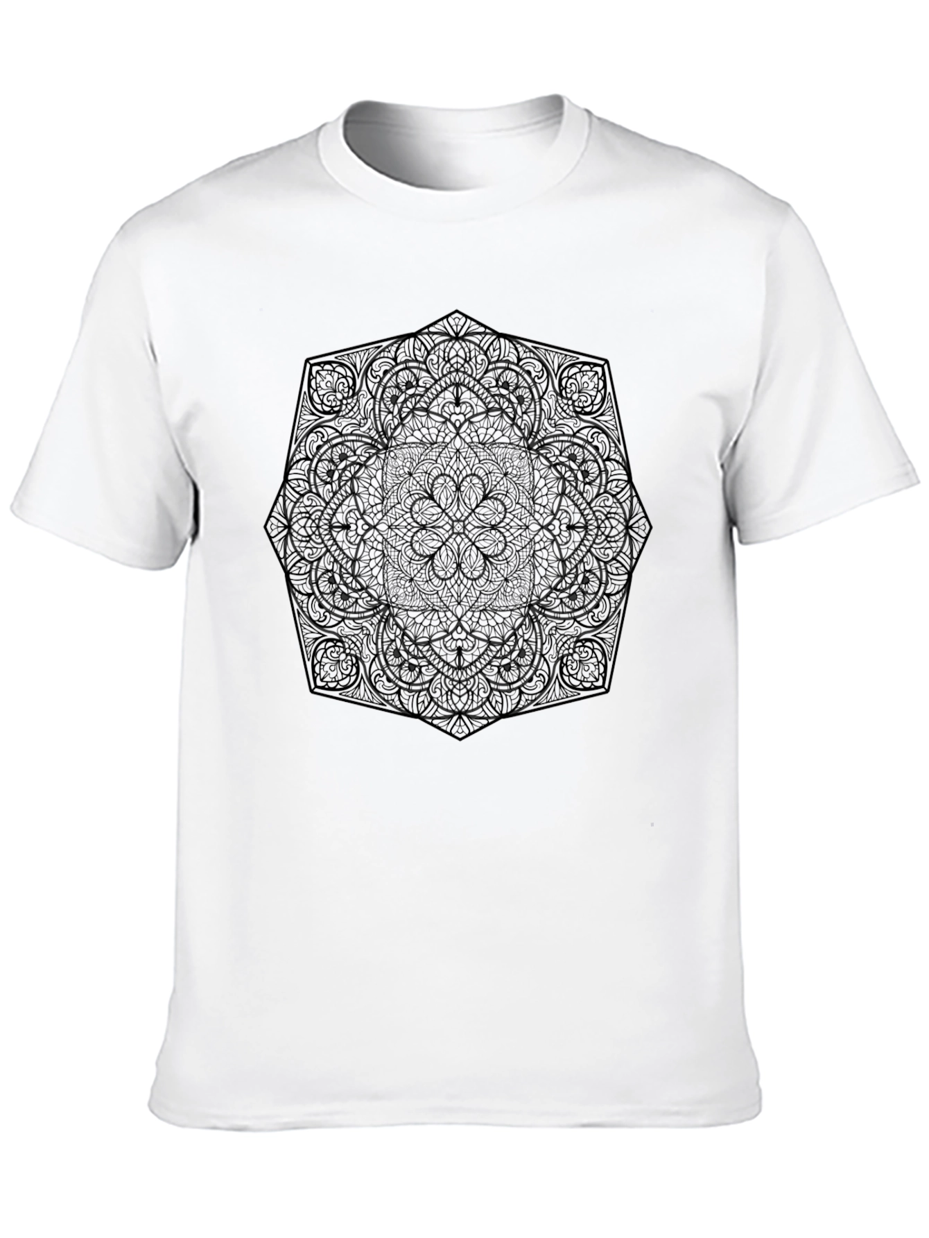 Embrace understated style with this black t-shirt featuring a detailed mandala print. The intricate design adds a touch of unique artistry to a classic wardrobe staple. Made from comfortable, breathable fabric, this tee is perfect for everyday wear. The dark color provides a versatile backdrop, making it easy to pair with jeans, shorts, or layered under a jacket. Whether you're going for a casual look or adding a subtle edge to your outfit, this mandala t-shirt will elevate your fashion game. Experience the perfect blend of comfort and distinctive design with this must-have tee.