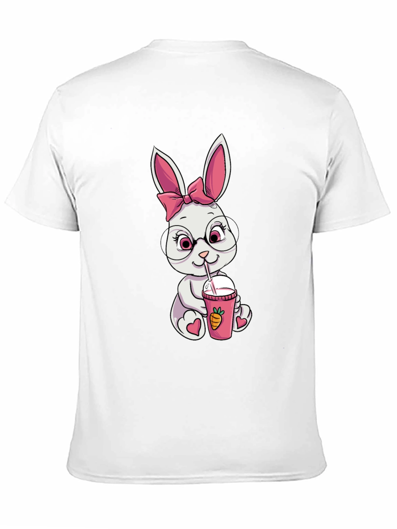 This classic fit tee features a cute graphic of a cartoon bunny. The bunny is wearing glasses and a bow and is enjoying a drink with a straw. Accented with heart details, this tee is perfect for adding a touch of whimsy to your wardrobe. Made from soft, breathable fabric, this tee offers all-day comfort. Whether you're lounging at home or headed out for a casual outing, this tee is a stylish and fun choice. Show off your playful side with this unique graphic tee. This would make a perfect gift for bunny lovers.