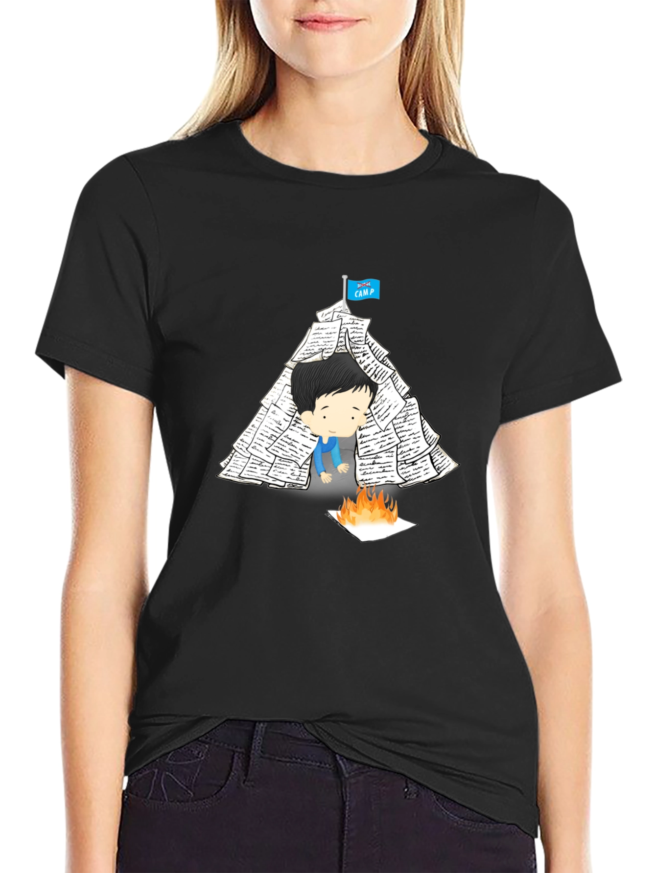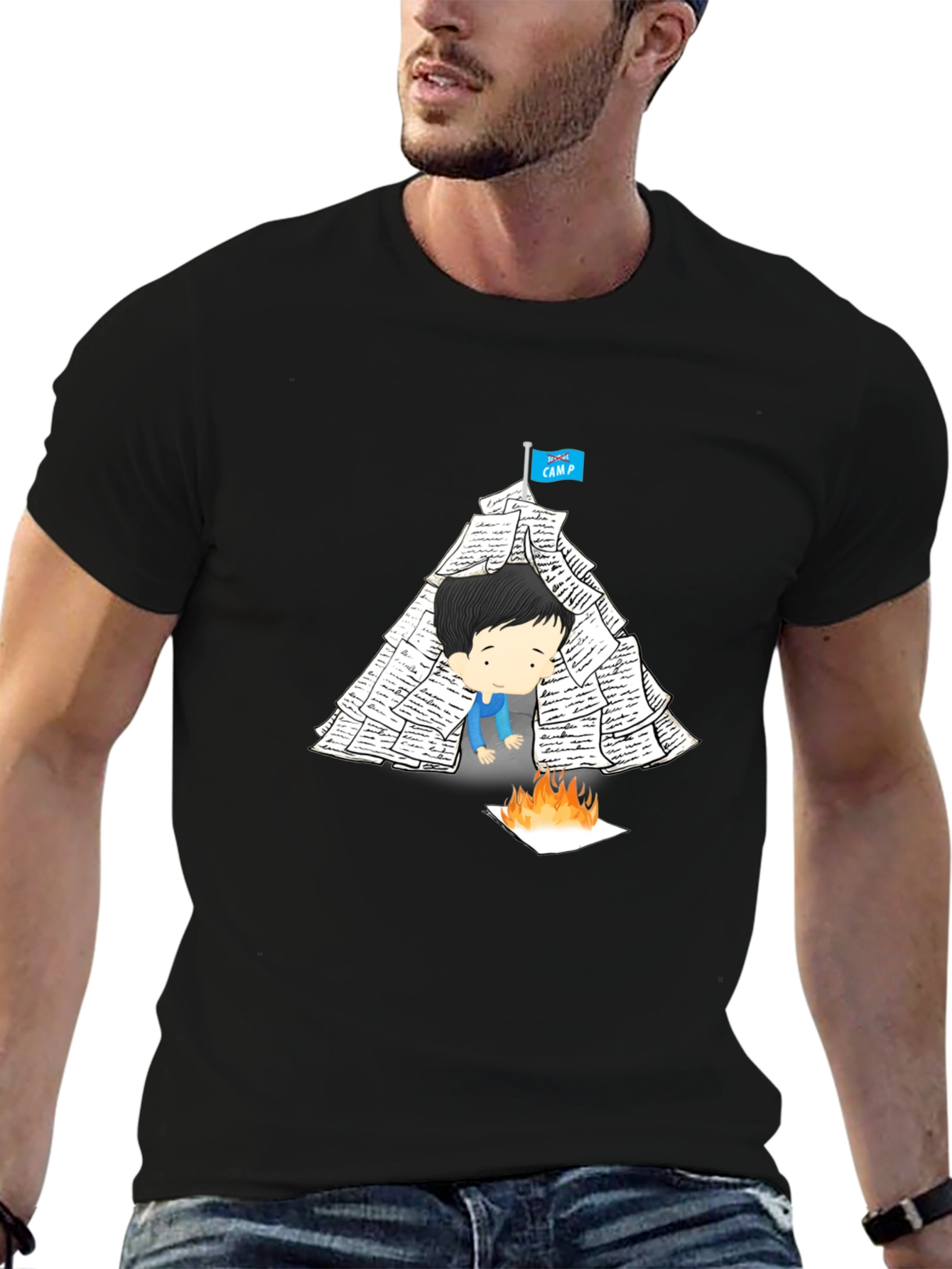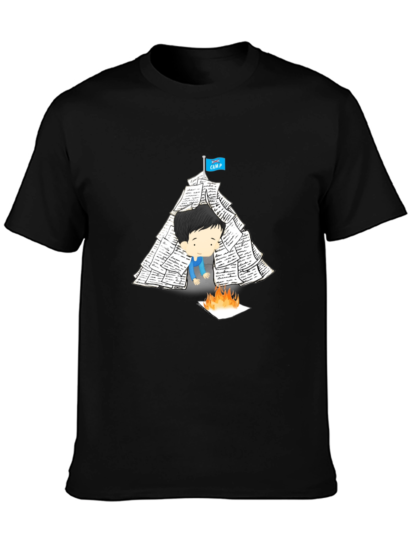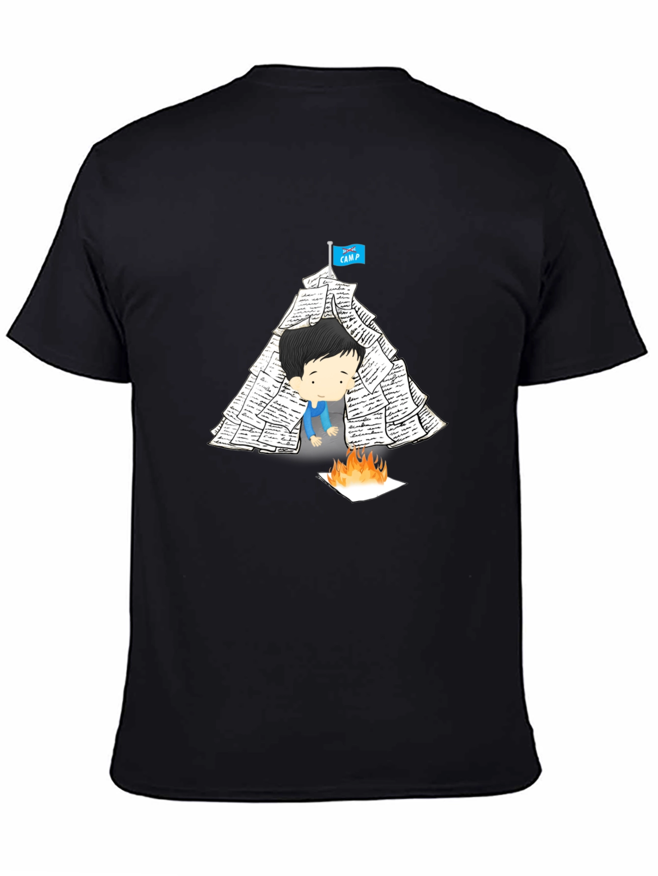 Embrace the spirit of adventure with this unique graphic tee! This black t-shirt features a whimsical design of a person nestled in a cozy fort made of paper, complete with a campfire and a flag. The eye-catching graphic is perfect for book lovers, writers, and anyone who appreciates a touch of whimsy. Made from soft and comfortable material, this shirt is ideal for casual wear, lounging at home, or making a statement wherever you go. Add a touch of creativity to your wardrobe with this conversation-starting tee!