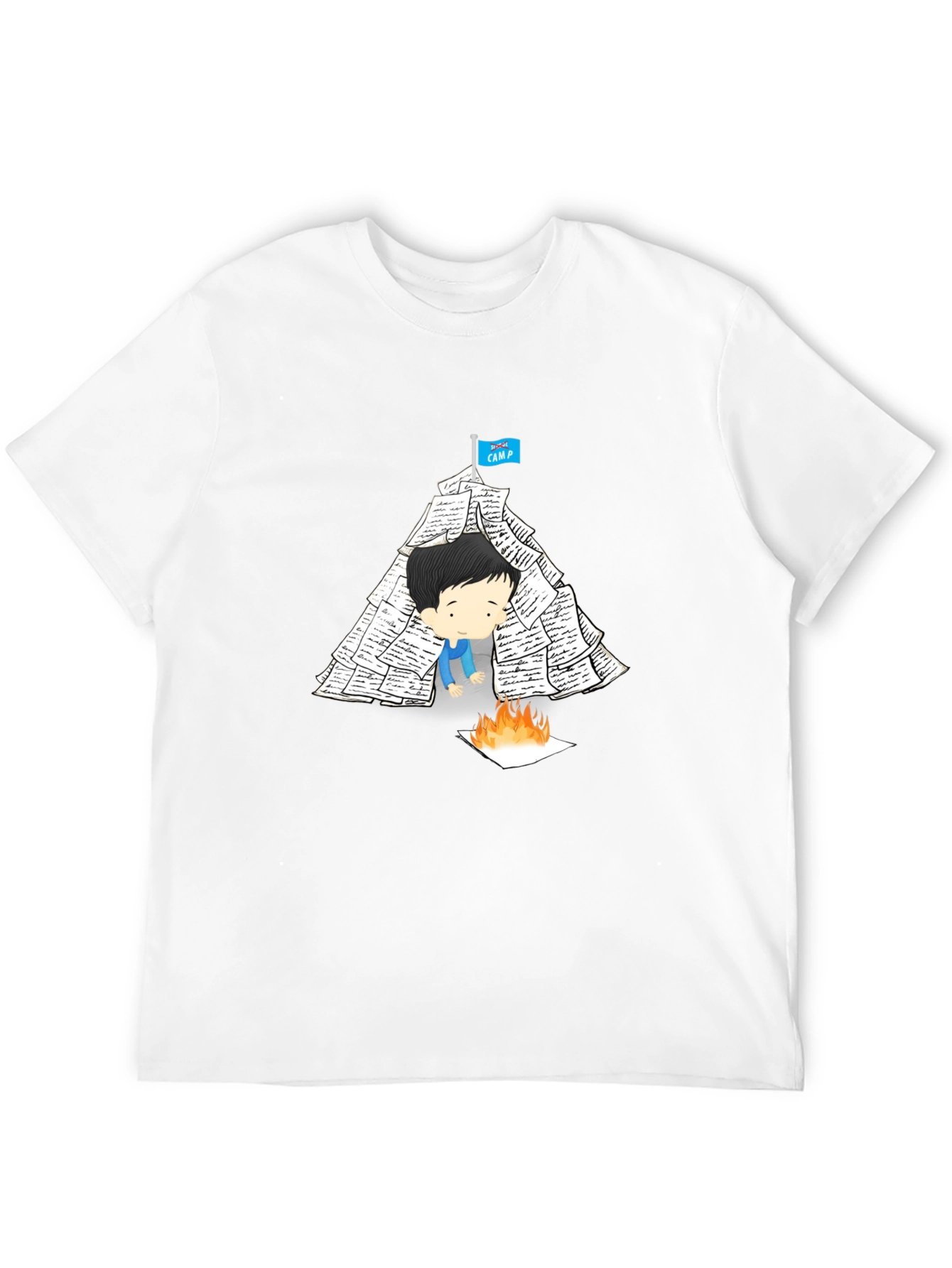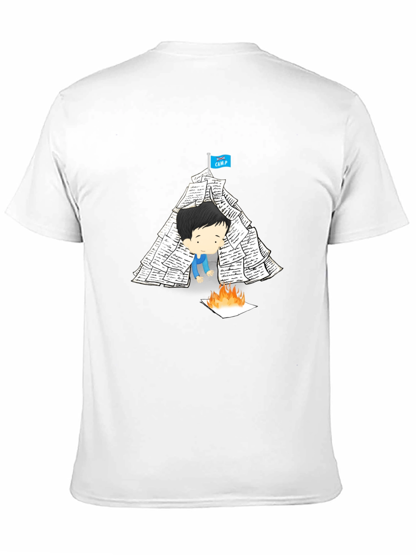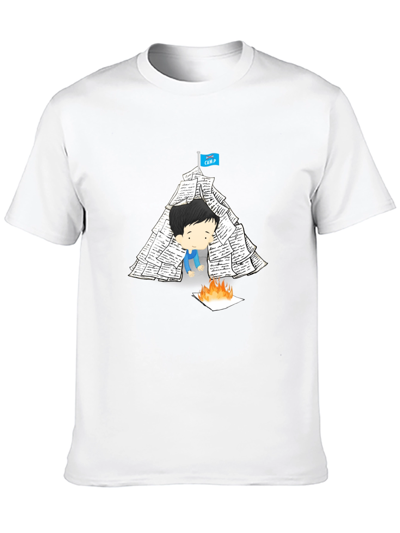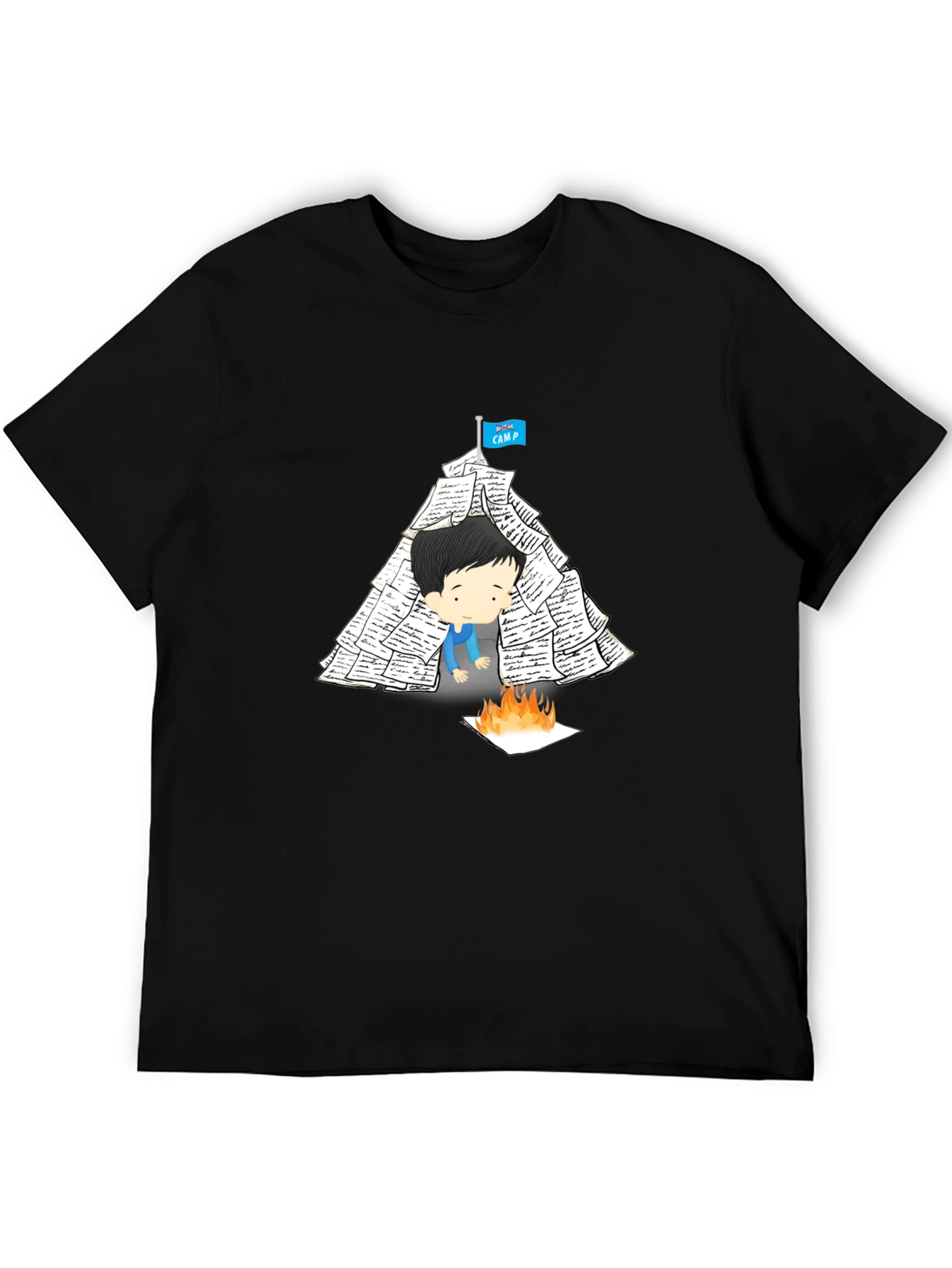 Embrace the spirit of adventure with this unique graphic tee! This black t-shirt features a whimsical design of a person nestled in a cozy fort made of paper, complete with a campfire and a flag. The eye-catching graphic is perfect for book lovers, writers, and anyone who appreciates a touch of whimsy. Made from soft and comfortable material, this shirt is ideal for casual wear, lounging at home, or making a statement wherever you go. Add a touch of creativity to your wardrobe with this conversation-starting tee!