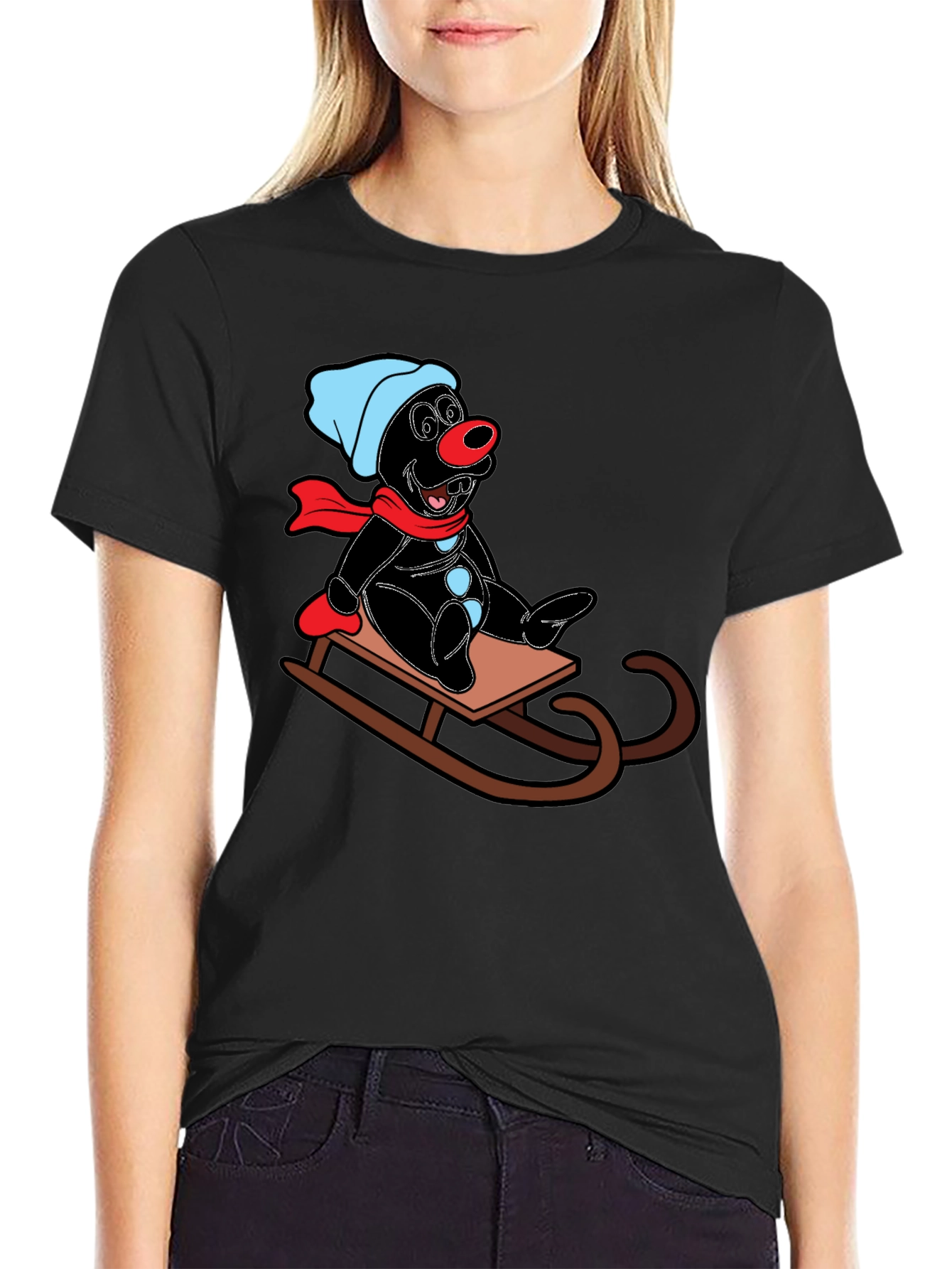 This black T-shirt features a cheerful cartoon of a mole riding a sled. The mole is depicted with a light blue hat and matching mittens, a red scarf, and a distinctive red nose. The sled is brown, completing the playful winter scene. The T-shirt is made of what appears to be a soft, comfortable material, perfect for everyday wear. It's an ideal choice for those who enjoy whimsical designs or anyone looking for a unique and eye-catching garment. Wear it casually or pair it with jeans for a fun, laid-back look. This T-shirt is sure to bring a smile to your face.