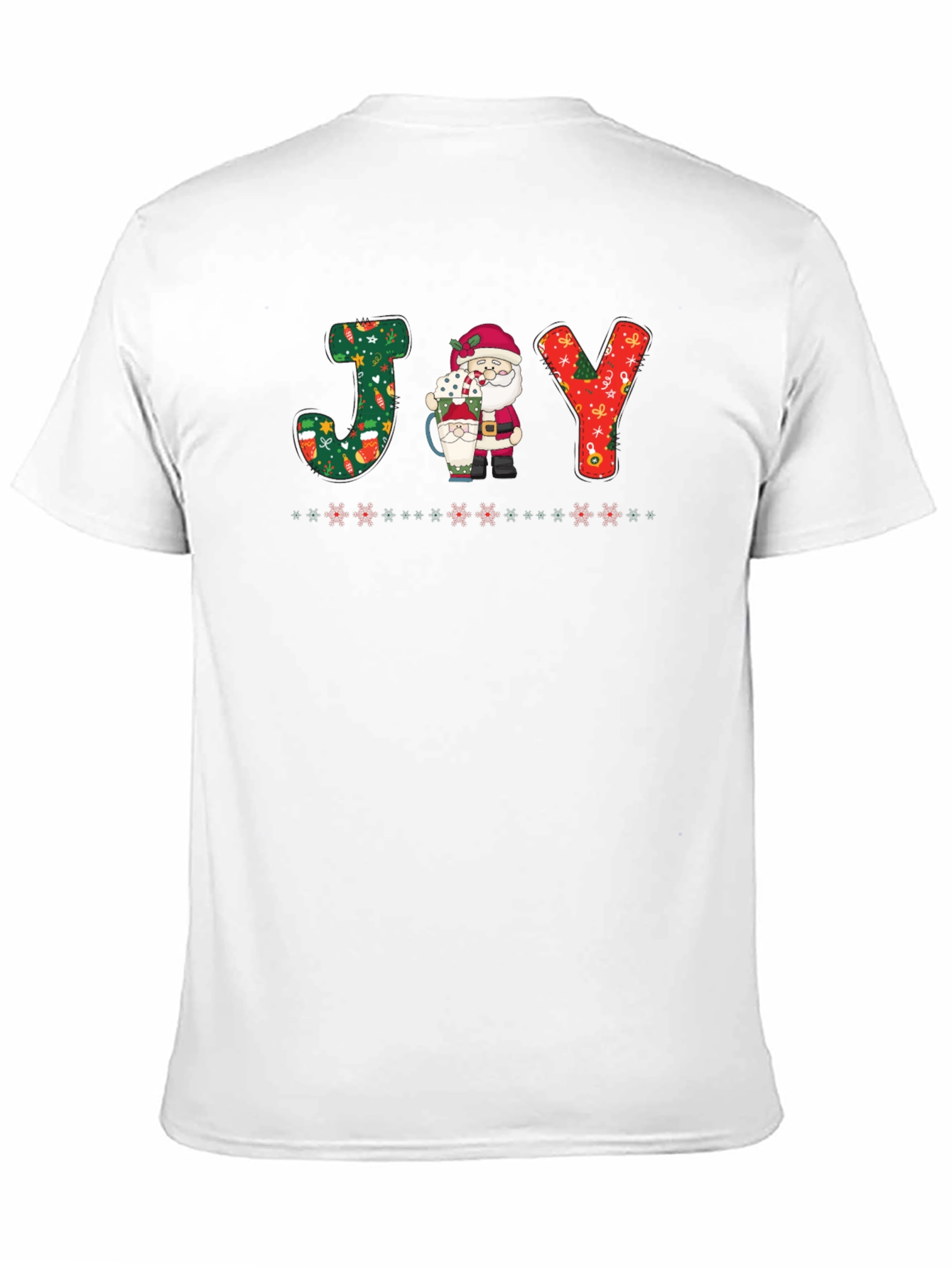 Spread holiday cheer with this fun and festive black t-shirt! The shirt features the word "JOY" in a playful Christmas-themed design. The "J" is adorned with festive Christmas patterns like stockings and stars, while Santa Claus stands in for the "O," holding a tiny gnome. The "Y" is patterned with classic holiday shapes and colors, completing the joyful message. Perfect for Christmas parties, family gatherings, or just adding a touch of holiday spirit to your everyday wardrobe. This unique tee is sure to be a conversation starter and a festive addition to your holiday collection!