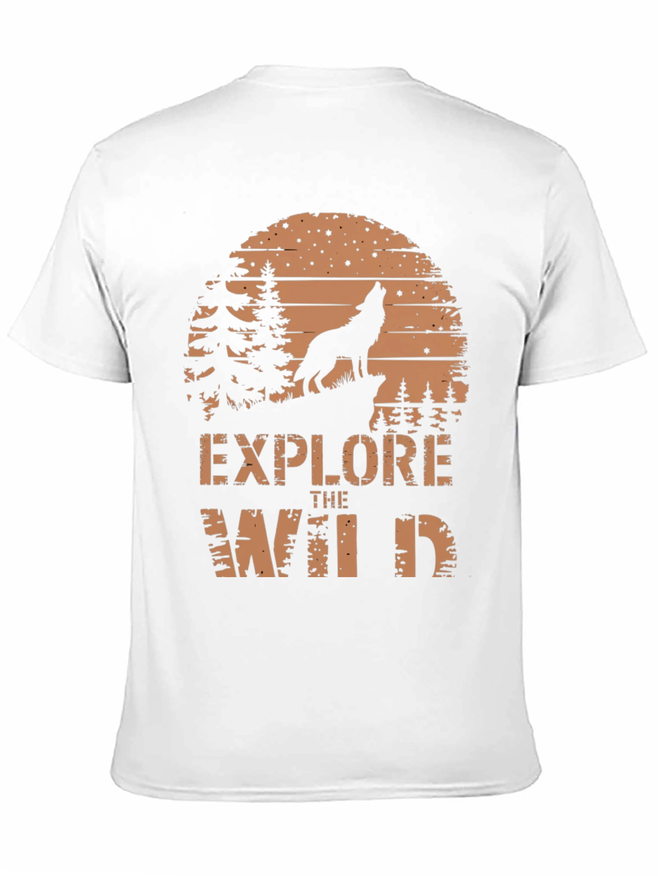 Embrace your adventurous spirit with this striking black graphic tee. The design features a howling wolf silhouette amidst a rustic landscape, set against a vintage-style sun background. "Explore the Wild" is boldly printed in distressed lettering. Made from a soft, comfortable fabric, this shirt is perfect for casual wear, outdoor adventures, or expressing your love for nature. Pair it with jeans or shorts for a laid-back yet stylish look. This unique tee is sure to spark conversations and make a statement wherever you go. Show off your wild side!