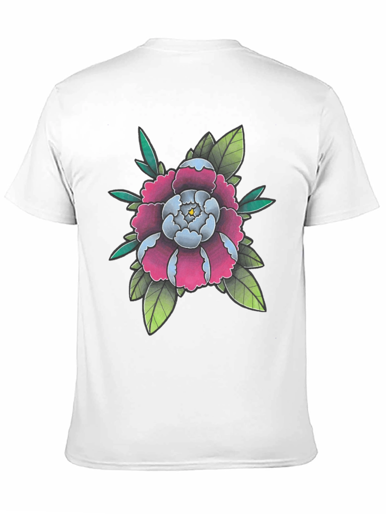 Elevate your casual style with this striking black t-shirt featuring a bold floral tattoo-inspired design. The vibrant print showcases a richly detailed flower with deep red petals, cool grey accents, and lush green leaves, creating a captivating focal point. Crafted from a comfortable, breathable fabric, this tee offers a relaxed fit perfect for everyday wear. Pair it with your favorite jeans for a laid-back look or dress it up with a blazer for a touch of edgy sophistication. This unique t-shirt is sure to turn heads and make a statement wherever you go.