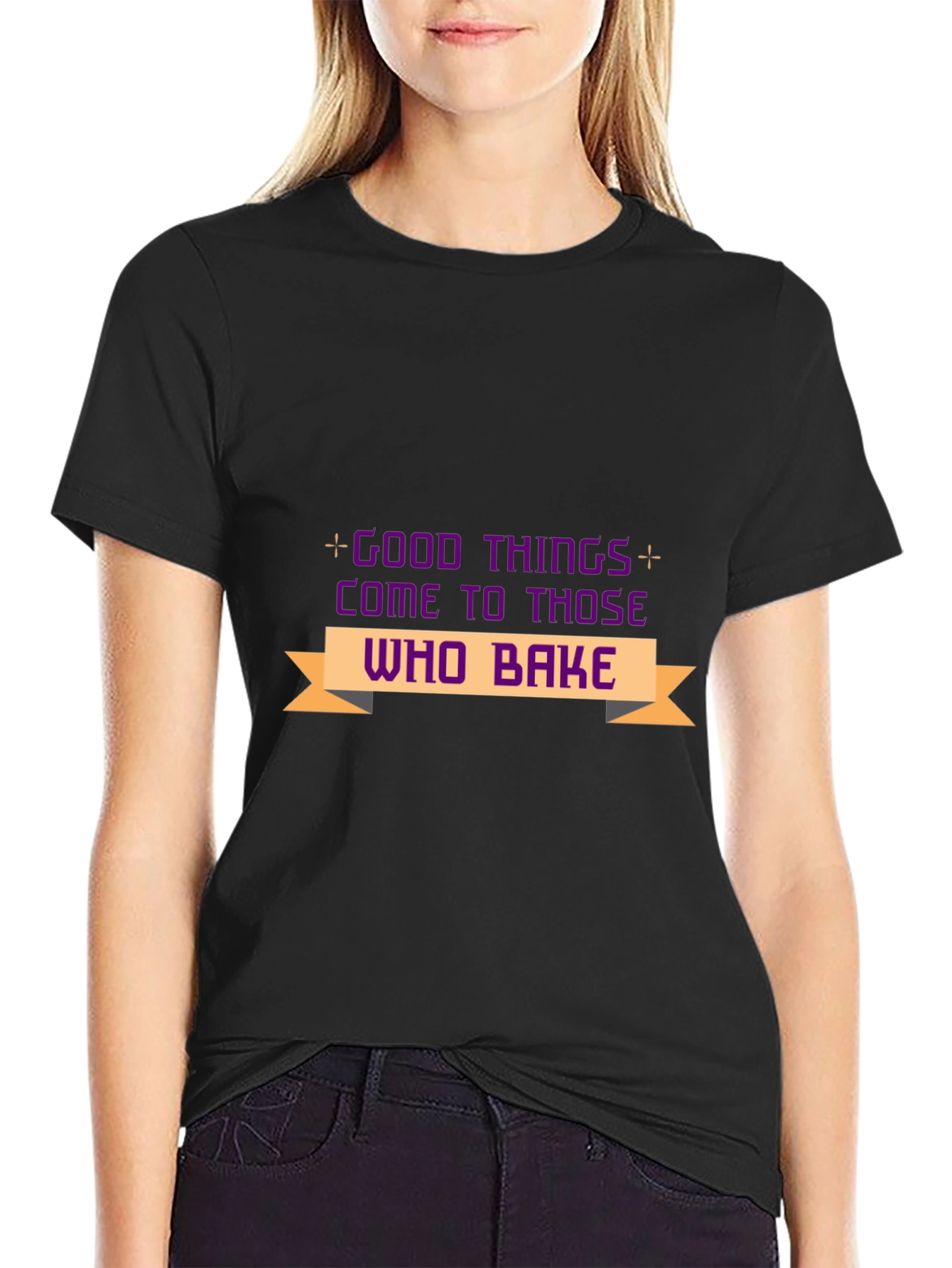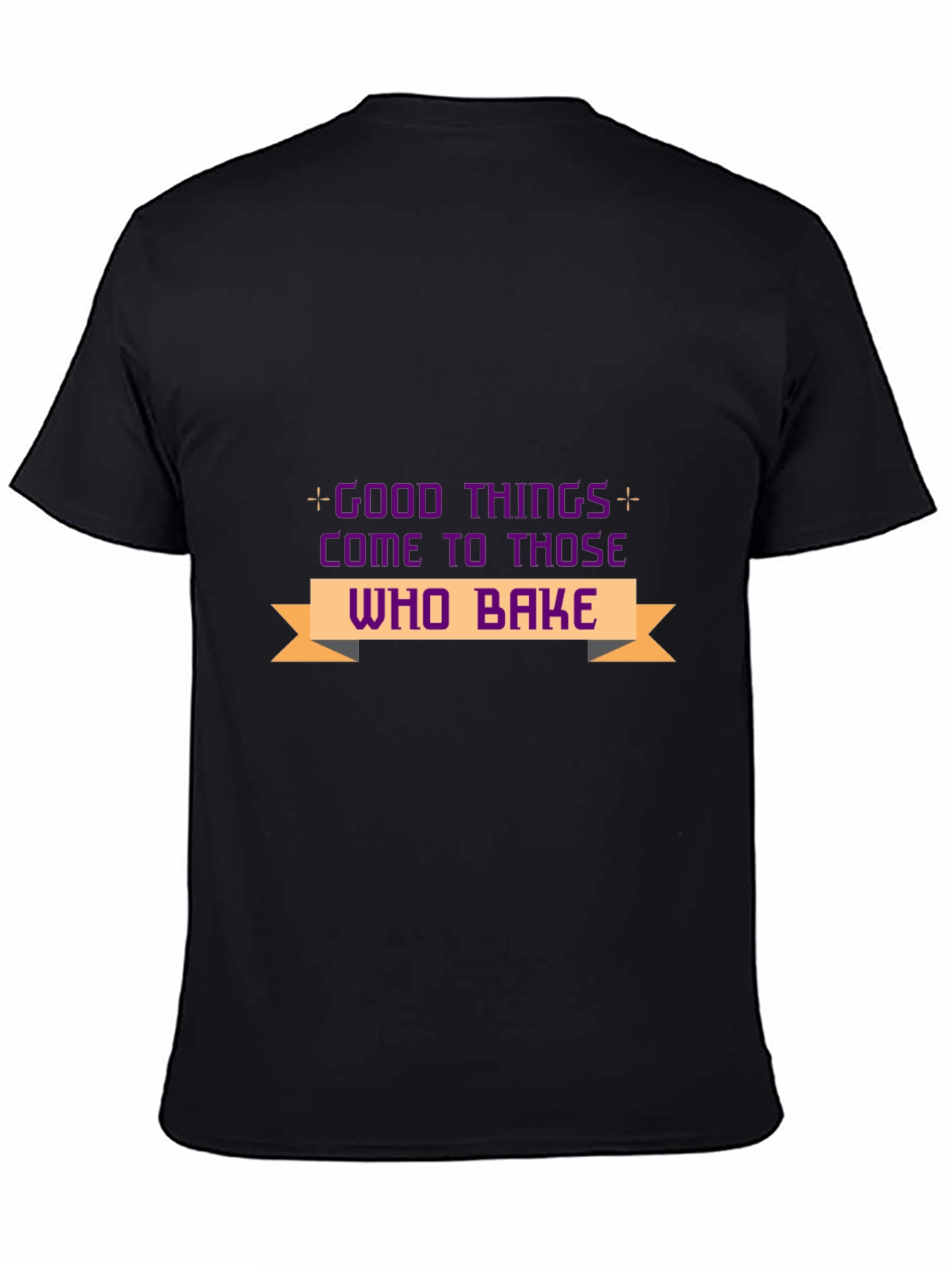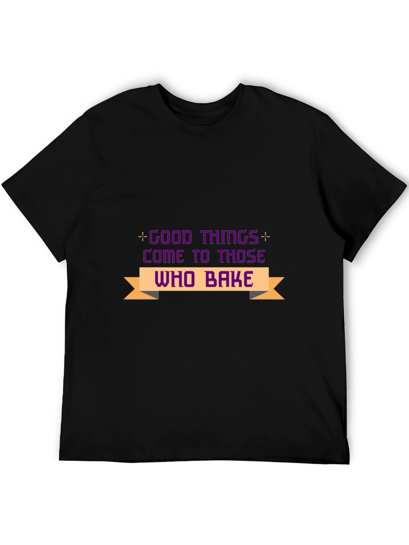 Show your love for baking with this stylish black t-shirt! Featuring a fun graphic design that reads "Good Things Come To Those Who Bake" in vibrant purple lettering and an appealing banner, this shirt is perfect for bakers and baking enthusiasts. The design is eye-catching and the comfortable fit makes it ideal for everyday wear, whether you're in the kitchen creating delicious treats or out and about. A great conversation starter for baking enthusiasts! Makes a thoughtful gift for the baker in your life.