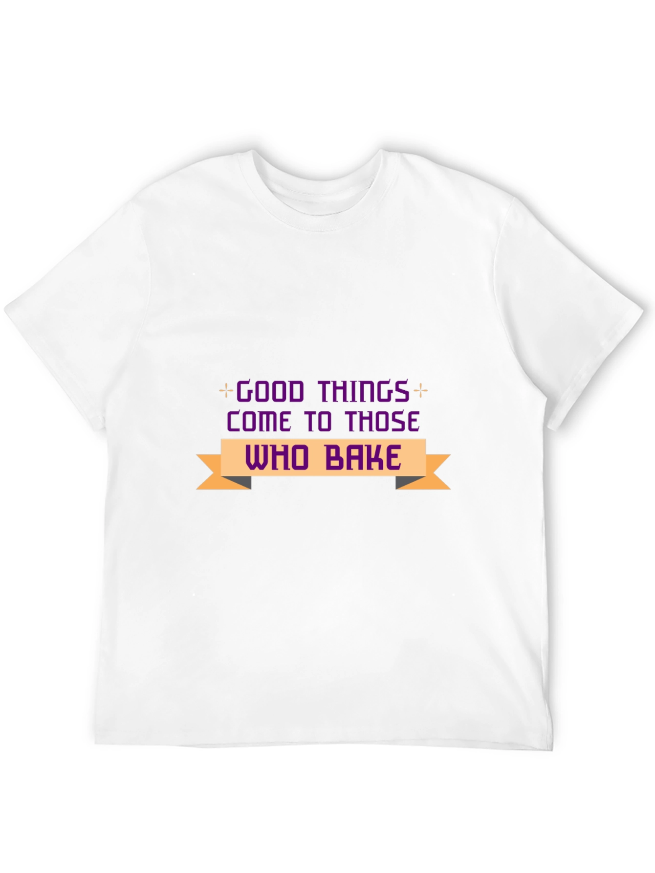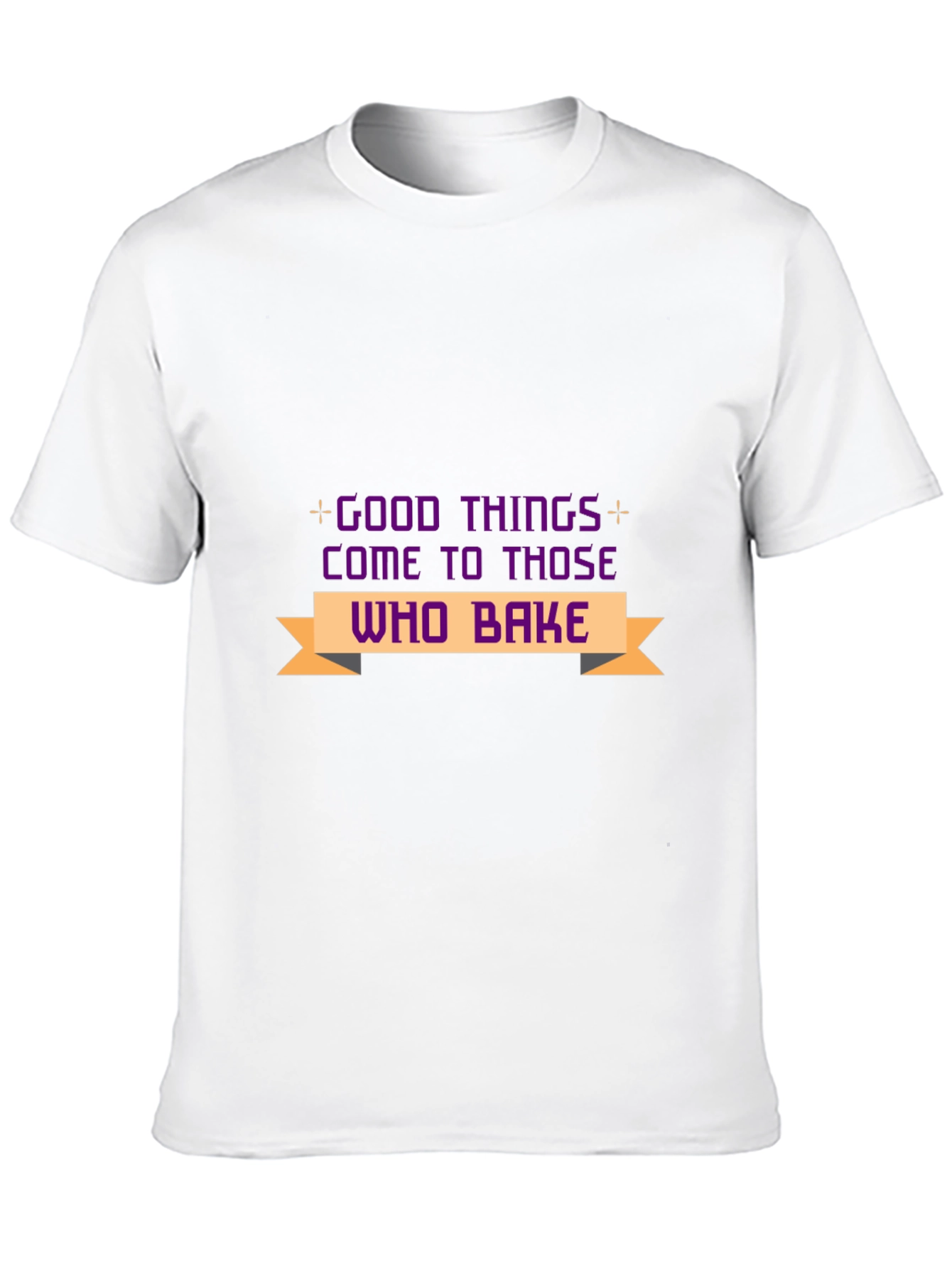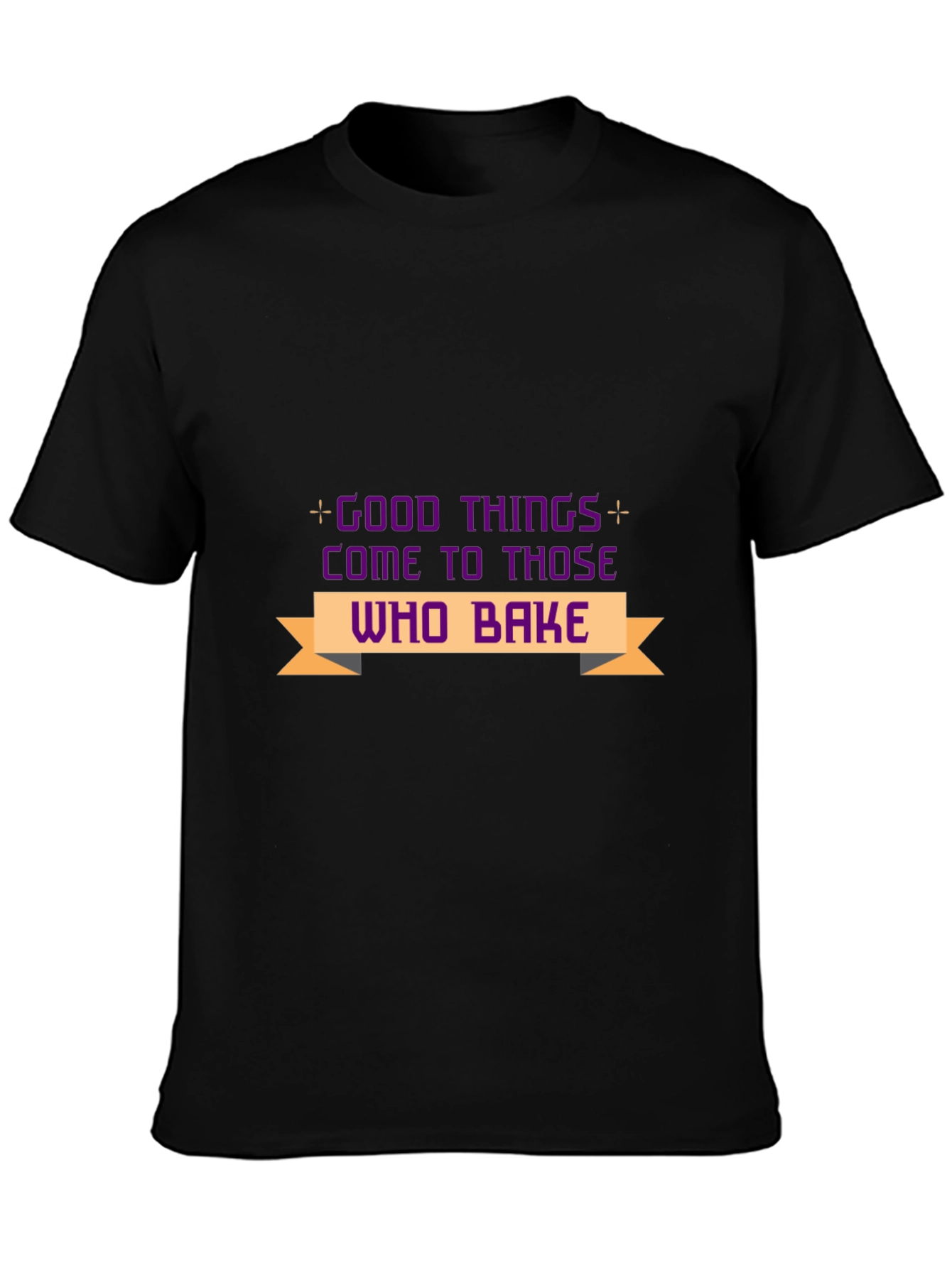 Show your love for baking with this stylish black t-shirt! Featuring a fun graphic design that reads "Good Things Come To Those Who Bake" in vibrant purple lettering and an appealing banner, this shirt is perfect for bakers and baking enthusiasts. The design is eye-catching and the comfortable fit makes it ideal for everyday wear, whether you're in the kitchen creating delicious treats or out and about. A great conversation starter for baking enthusiasts! Makes a thoughtful gift for the baker in your life.
