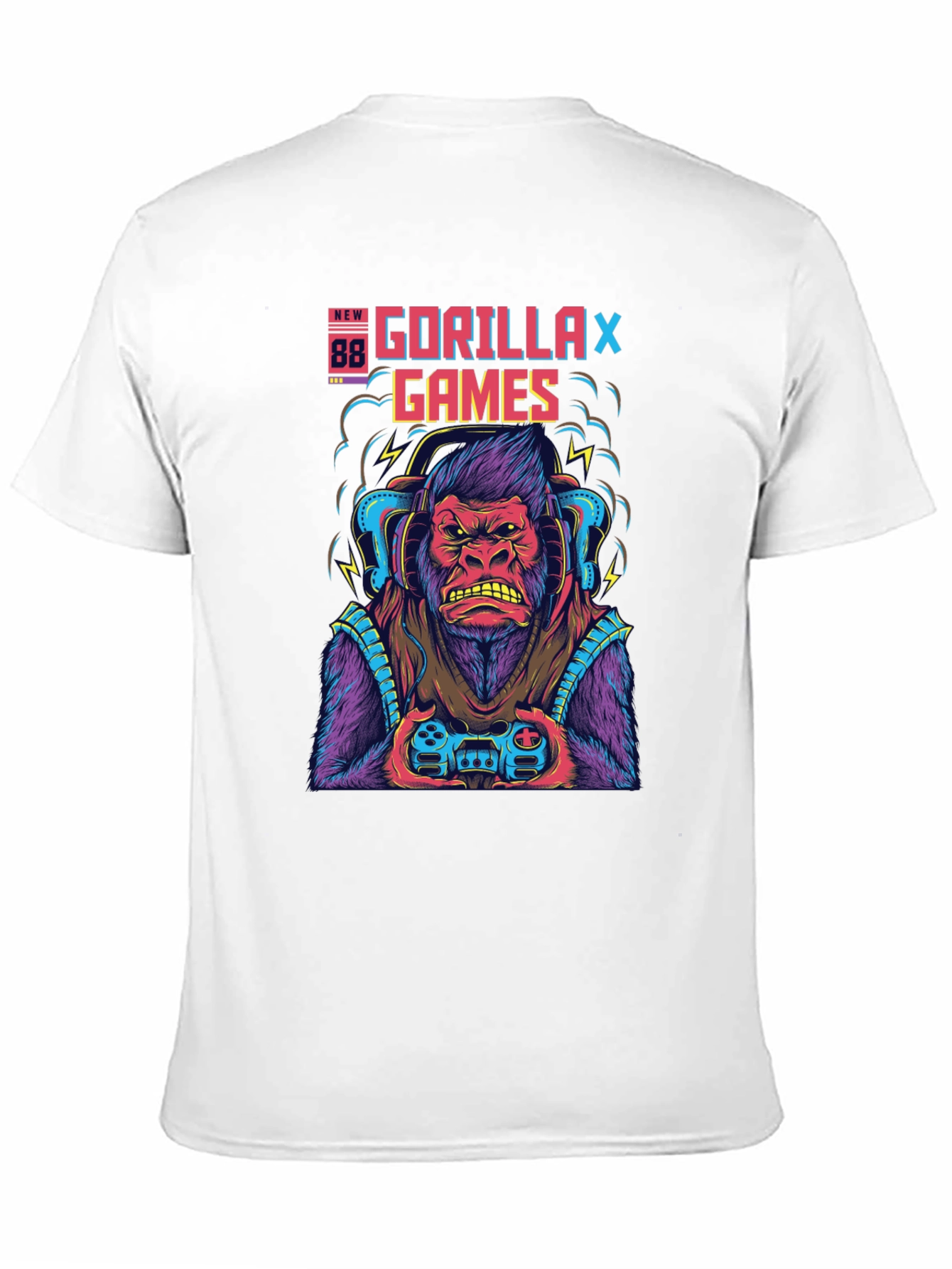 Unleash your inner gamer with this eye-catching black T-shirt! Featuring a vibrant graphic of a determined gorilla wearing headphones and clutching a game controller, this tee is perfect for gaming enthusiasts. The bold "GORILLA GAMES" text and neon accents add a touch of retro arcade style. Made from comfortable, breathable fabric, it's ideal for long gaming sessions or casual wear. Show off your passion for gaming with this unique and stylish tee!