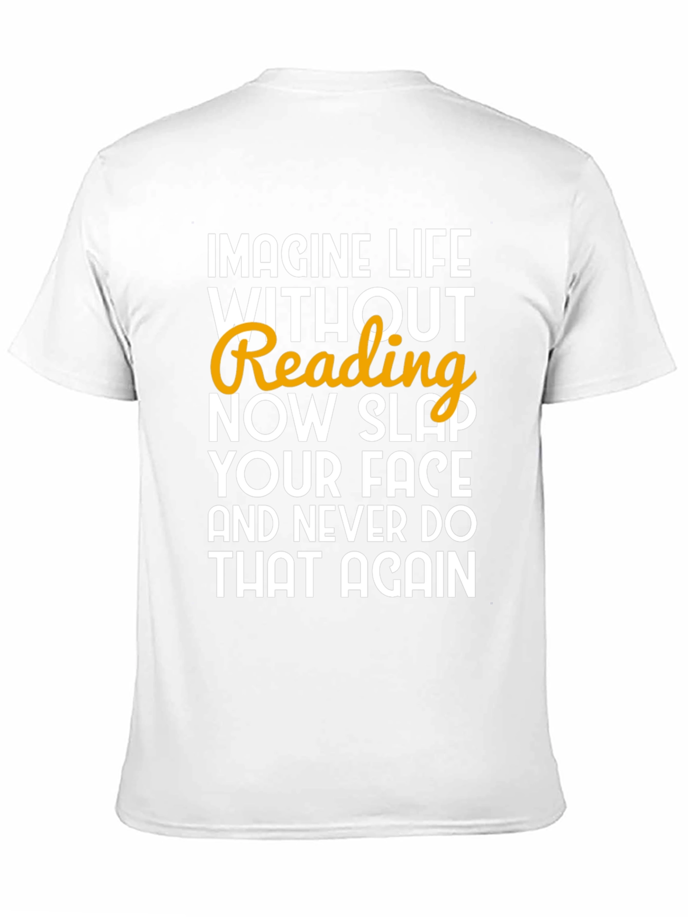 Express your love for reading with this bold, black graphic t-shirt! The shirt features the humorous saying, "Imagine Life Without Reading Now Slap Your Face and Never Do That Again" in white lettering. The word "Reading" is highlighted in a contrasting yellow color. Made from comfortable, breathable fabric, this tee is perfect for book lovers, librarians, teachers, and anyone who appreciates the joy of reading. Wear it to the library, bookstore, or your next book club meeting to spark conversations and show off your literary passion. It's a fun and unique way to make a statement and celebrate the importance of reading.
