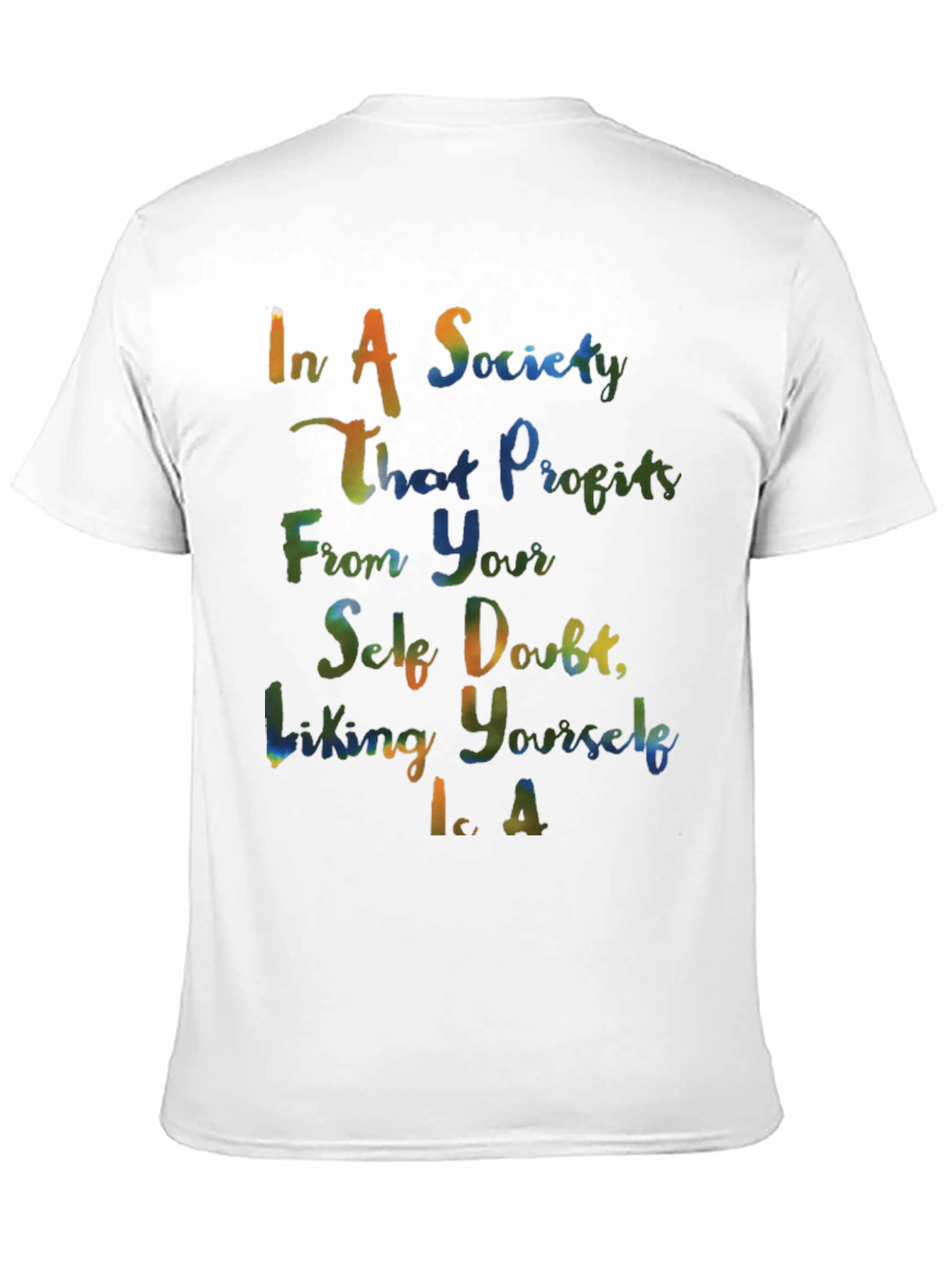Embrace self-acceptance with this unique black t-shirt. This stylish tee features a vibrant, colorful design with the empowering message: 'In A Society That Profits From Your Self Doubt, Liking Yourself Is A'. Crafted from a comfortable and breathable fabric, this shirt is perfect for everyday wear. Make a statement and inspire others with this positive and thought-provoking t-shirt. It's a great way to express individuality and promote a message of self-love. Suitable for casual outings, social gatherings, or simply lounging at home. Show off your self-assuredness and style with this one-of-a-kind garment!