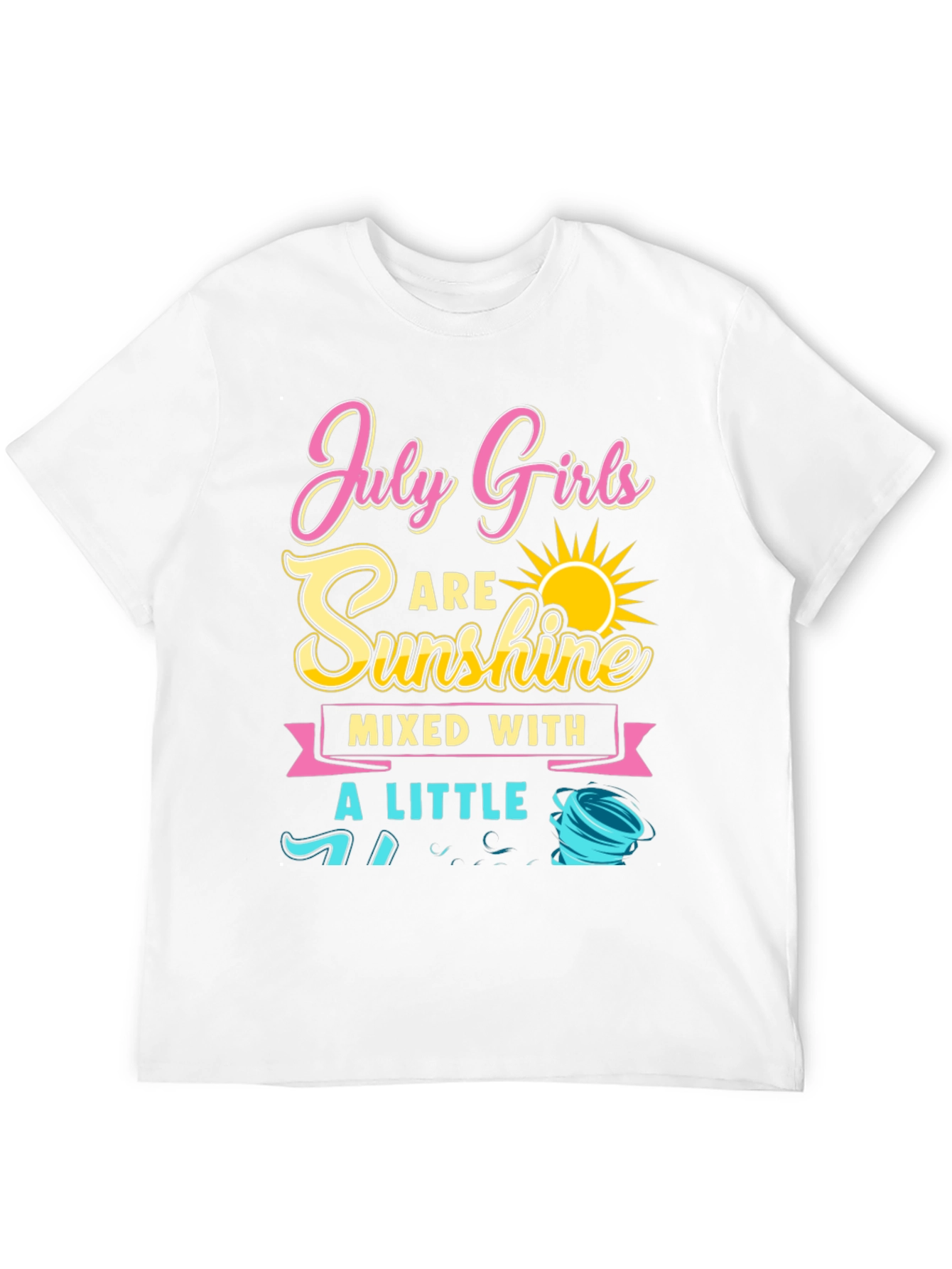 Show off your sunny disposition with a touch of feistiness in this fun graphic t-shirt! The design features the phrase "July Girls are Sunshine Mixed with a Little..." followed by a stylized image of a tornado. This implies that July-born girls can be both sweet and a bit wild! The shirt is black with vibrant pink, yellow, and turquoise lettering. It's a casual and comfortable way to express your personality. Perfect for everyday wear, birthday celebrations, or as a gift for the July girl in your life. Grab yours now and let your true colors shine!