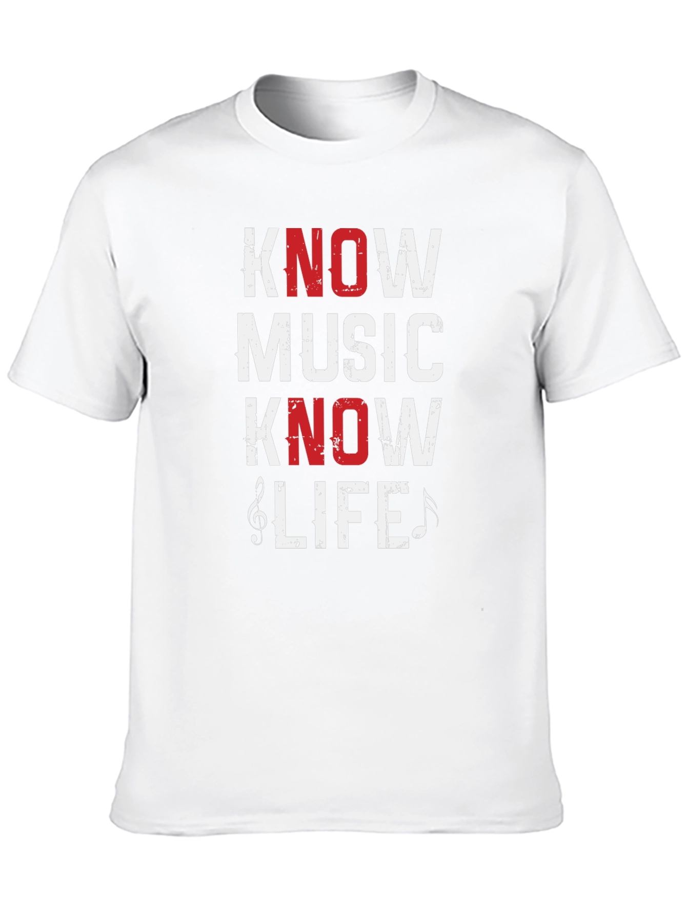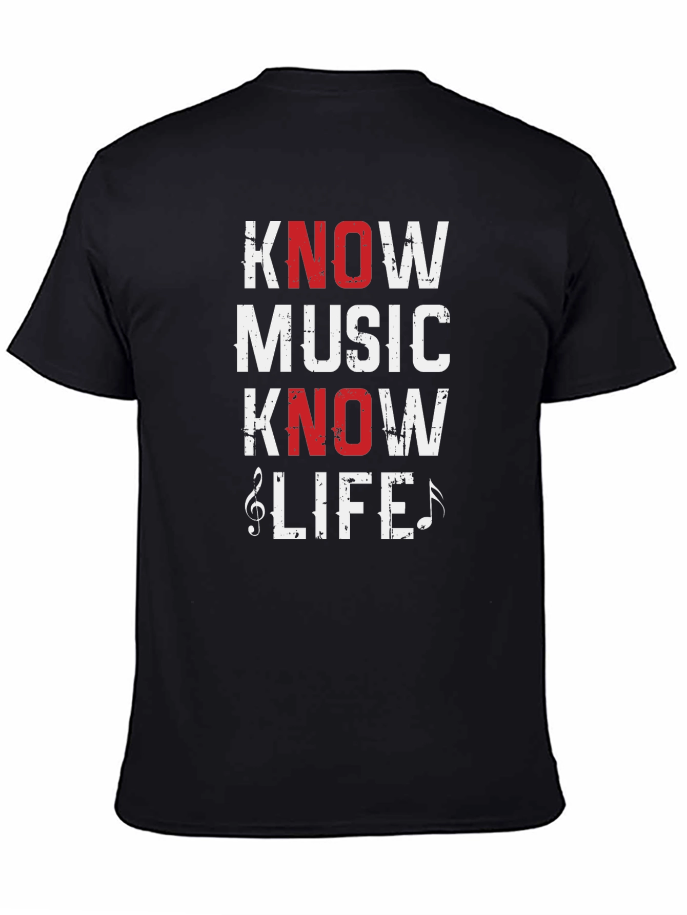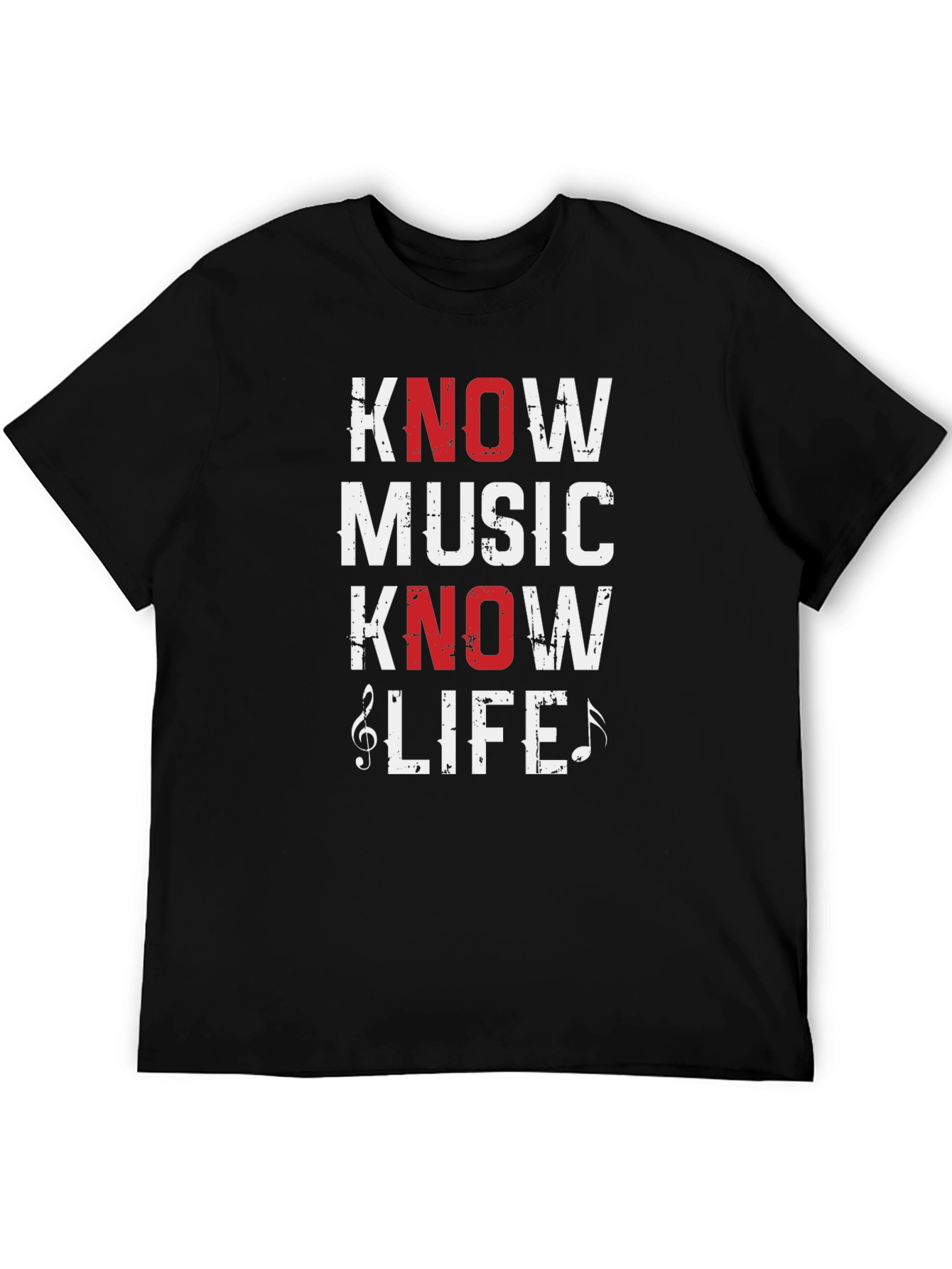Showcase your passion for music with this striking graphic tee. The shirt features the phrase "KNOW MUSIC KNOW LIFE" in a bold, distressed font, with the word "KNOW" highlighted in red for added impact. Musical notes add a touch of whimsy. Crafted from soft, breathable cotton, this tee offers all-day comfort and style. Its classic fit makes it versatile for casual outings, concerts, or simply expressing your love for music wherever you go. A must-have for any music enthusiast's wardrobe!