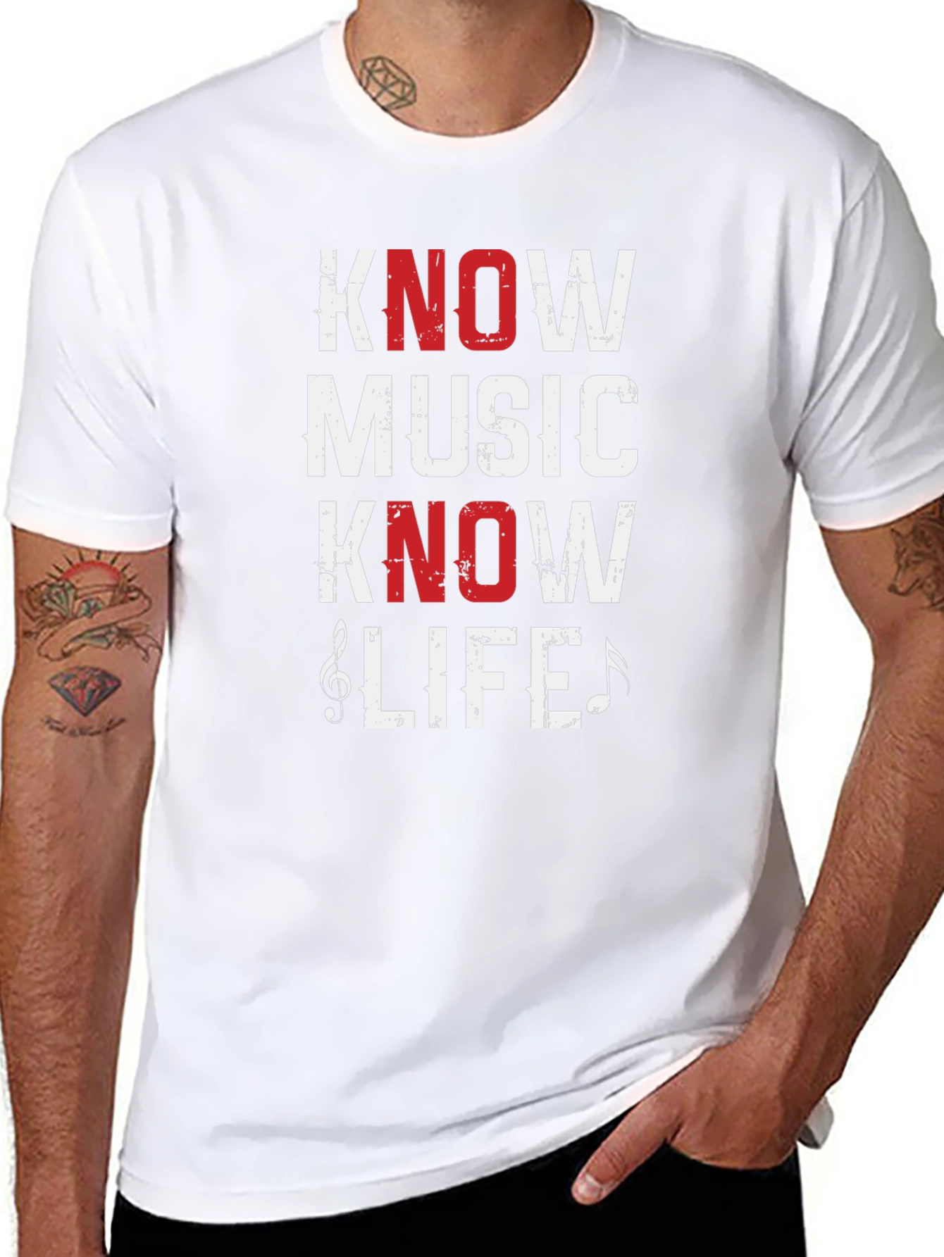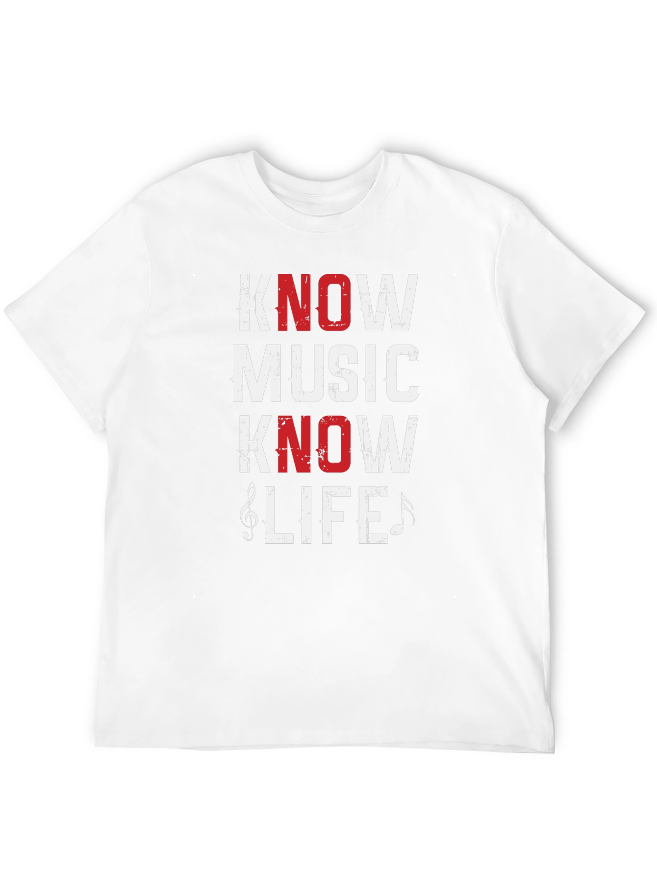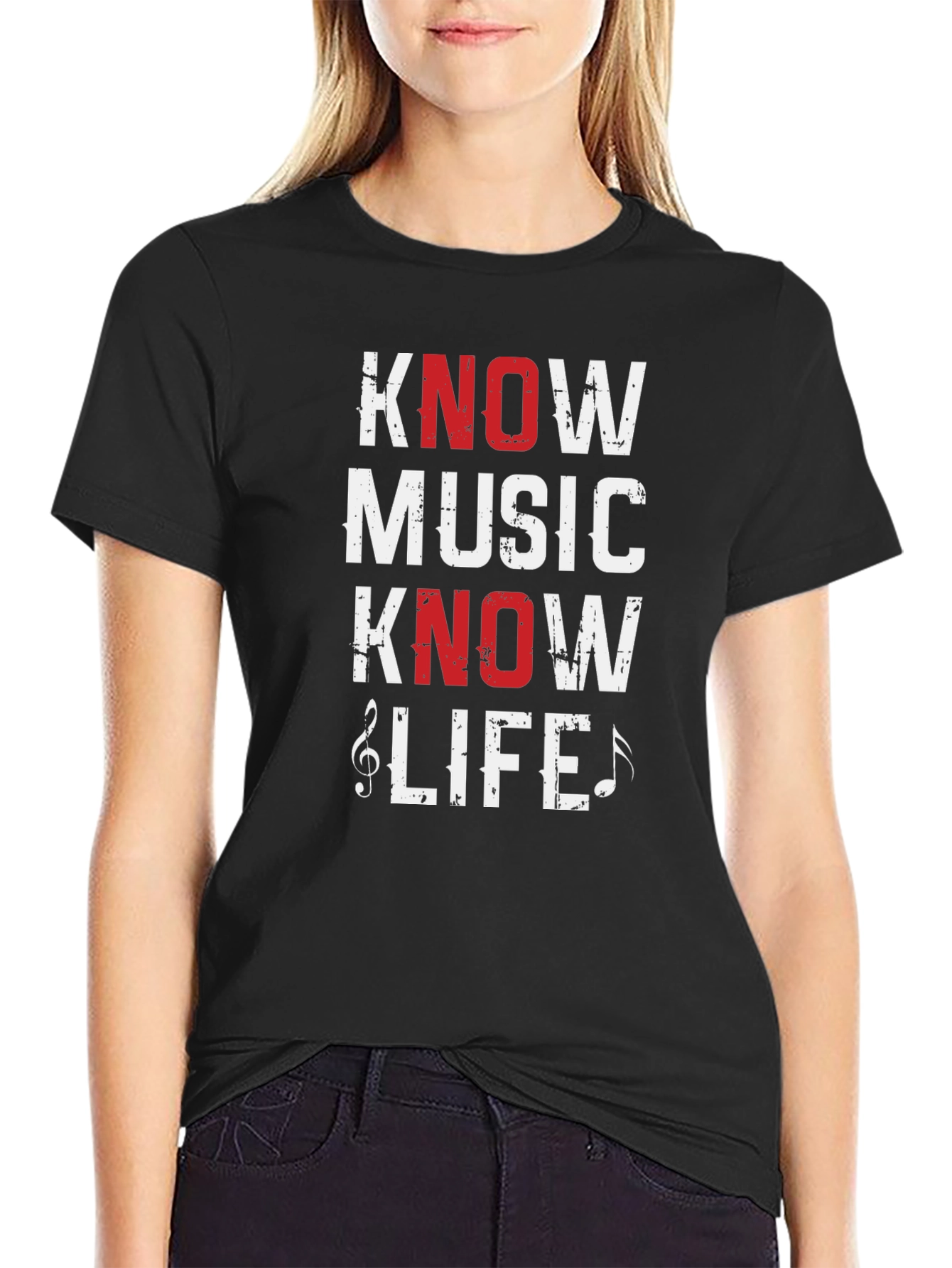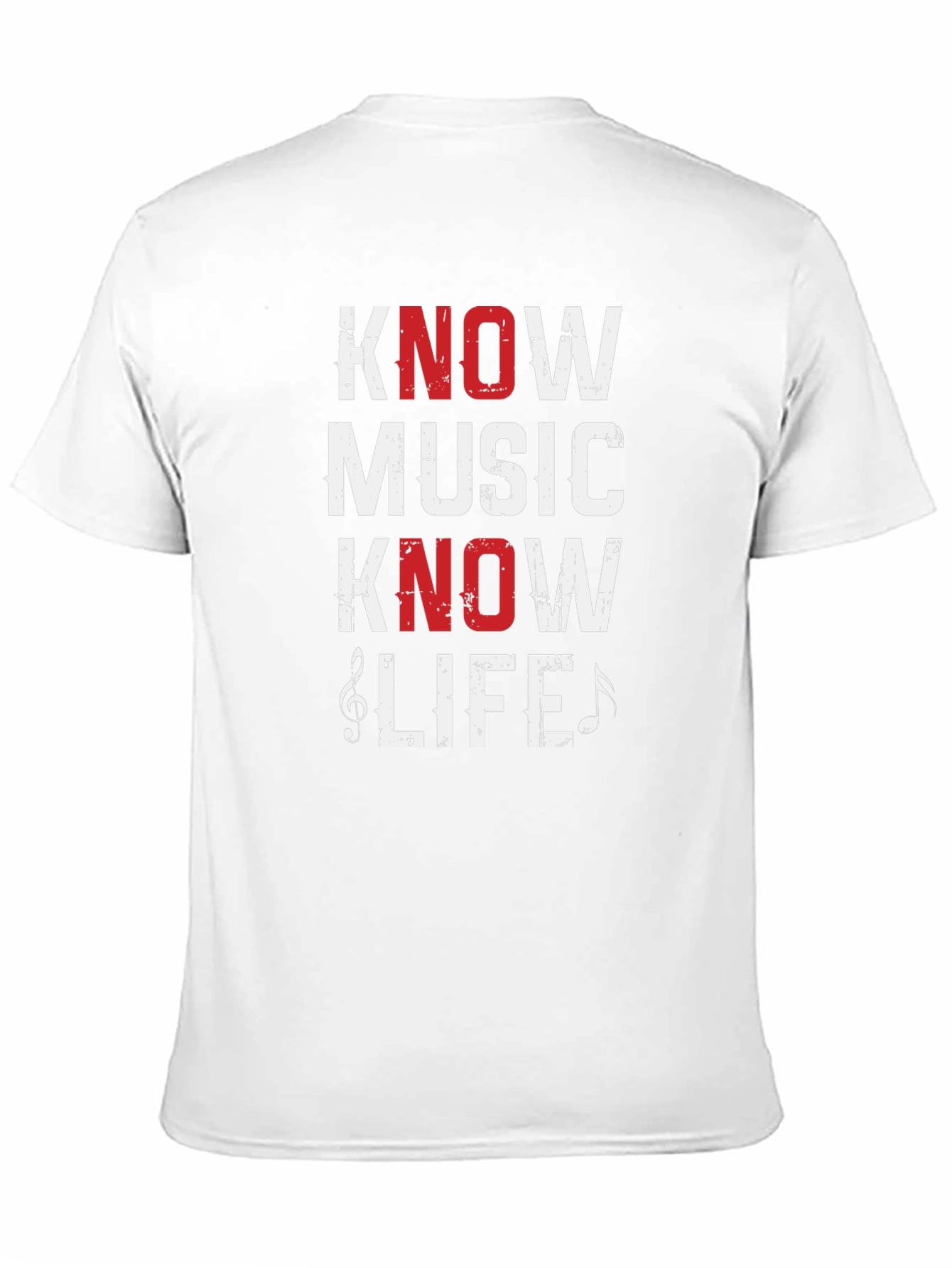 Showcase your passion for music with this striking graphic tee. The shirt features the phrase "KNOW MUSIC KNOW LIFE" in a bold, distressed font, with the word "KNOW" highlighted in red for added impact. Musical notes add a touch of whimsy. Crafted from soft, breathable cotton, this tee offers all-day comfort and style. Its classic fit makes it versatile for casual outings, concerts, or simply expressing your love for music wherever you go. A must-have for any music enthusiast's wardrobe!