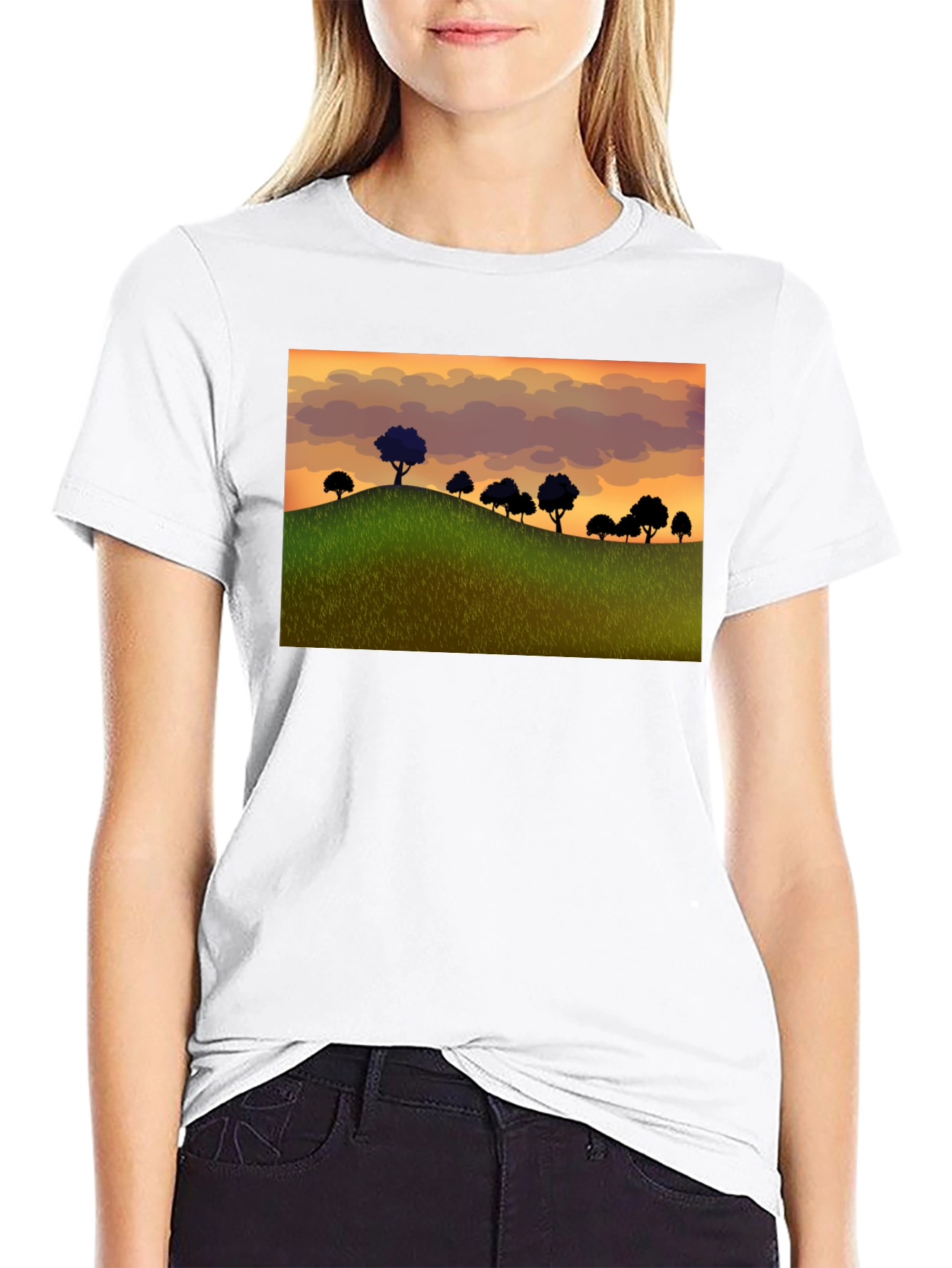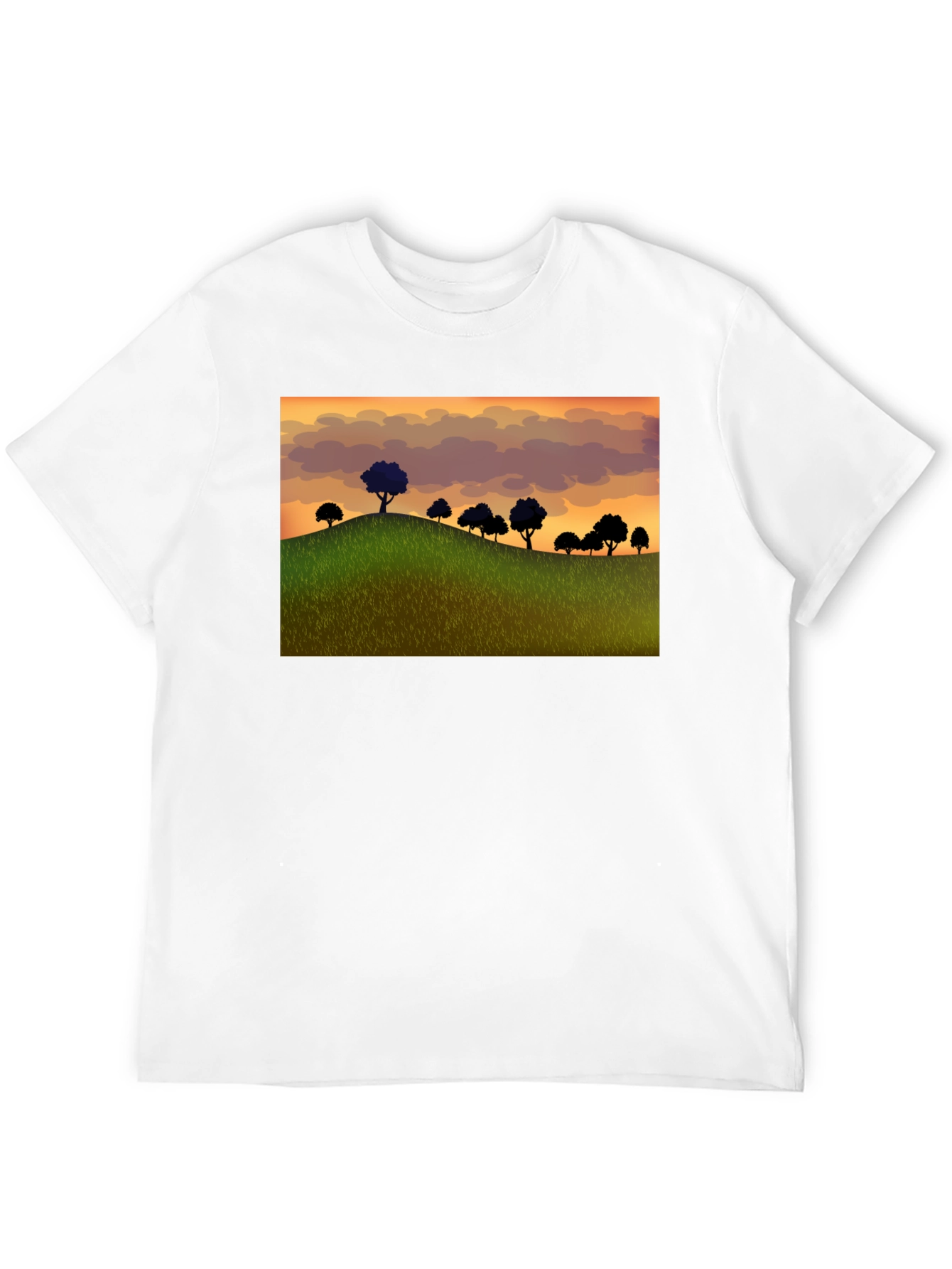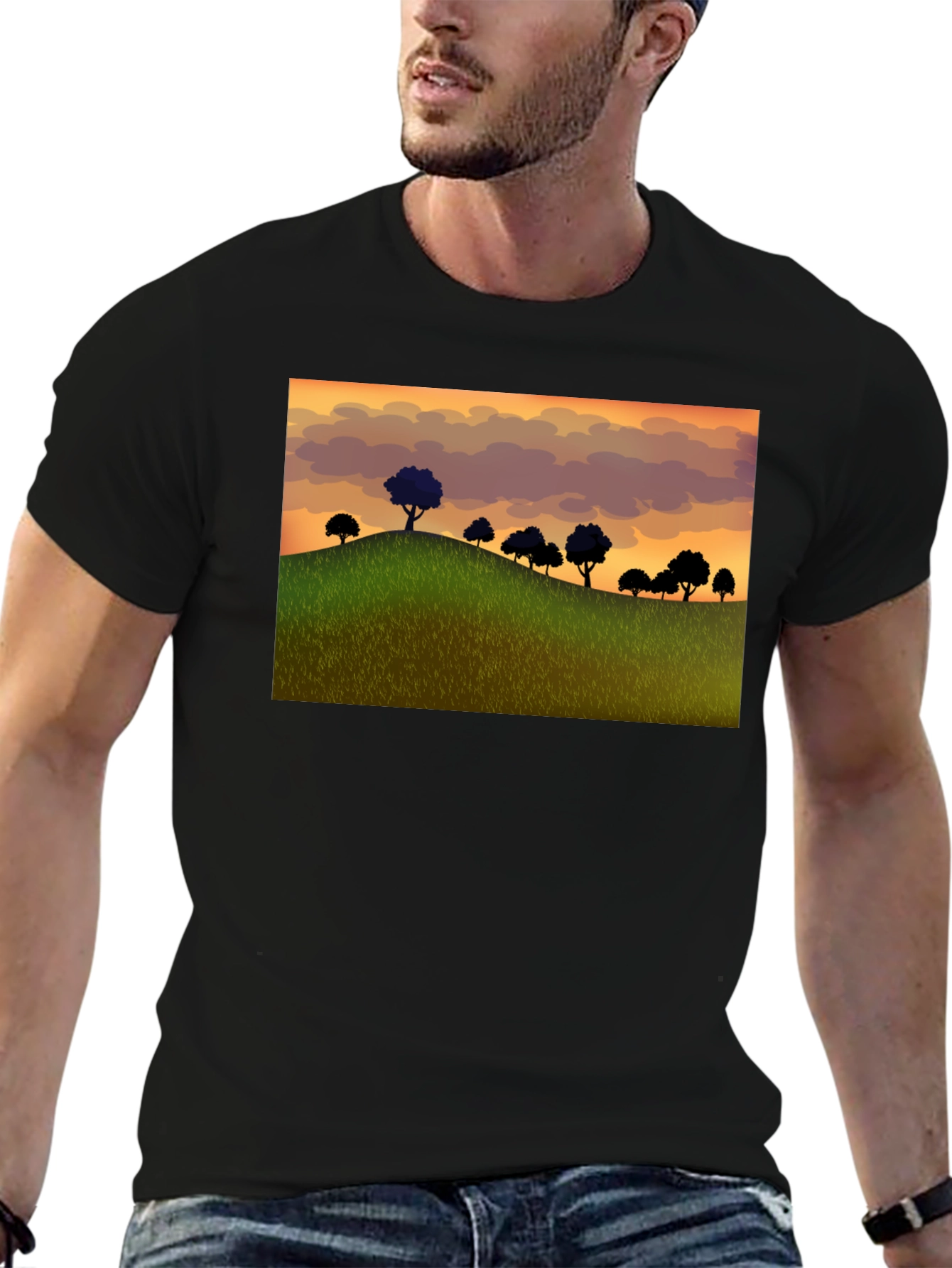 Embrace the tranquility of nature with this striking black t-shirt. The design features a picturesque scene of silhouetted trees atop a rolling green hill, set against a warm, gradient sky. This comfortable tee offers a relaxed fit and is perfect for casual wear, outdoor adventures, or simply expressing your love for the natural world. Made from soft, breathable fabric, this stylish t-shirt combines comfort and artistic flair. Add this unique piece to your wardrobe and let your style reflect your appreciation for the beauty of nature.