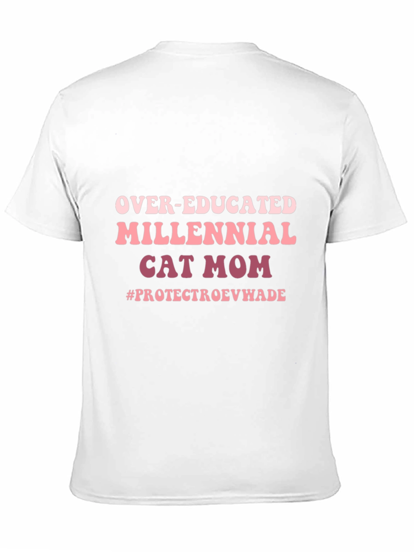 Show off your unique style with this eye-catching black t-shirt. The design features the phrase "Over-Educated Millennial Cat Mom" in a retro-style, layered pink font, complemented by the hashtag "#PROTECTROEVWADE." The comfortable, short-sleeved style makes it perfect for casual wear. Ideal for cat lovers, millennial women, and anyone looking to make a statement. This tee is sure to spark conversations and add a touch of humor to your wardrobe. Pair it with jeans, shorts, or a skirt for a versatile and trendy look.
