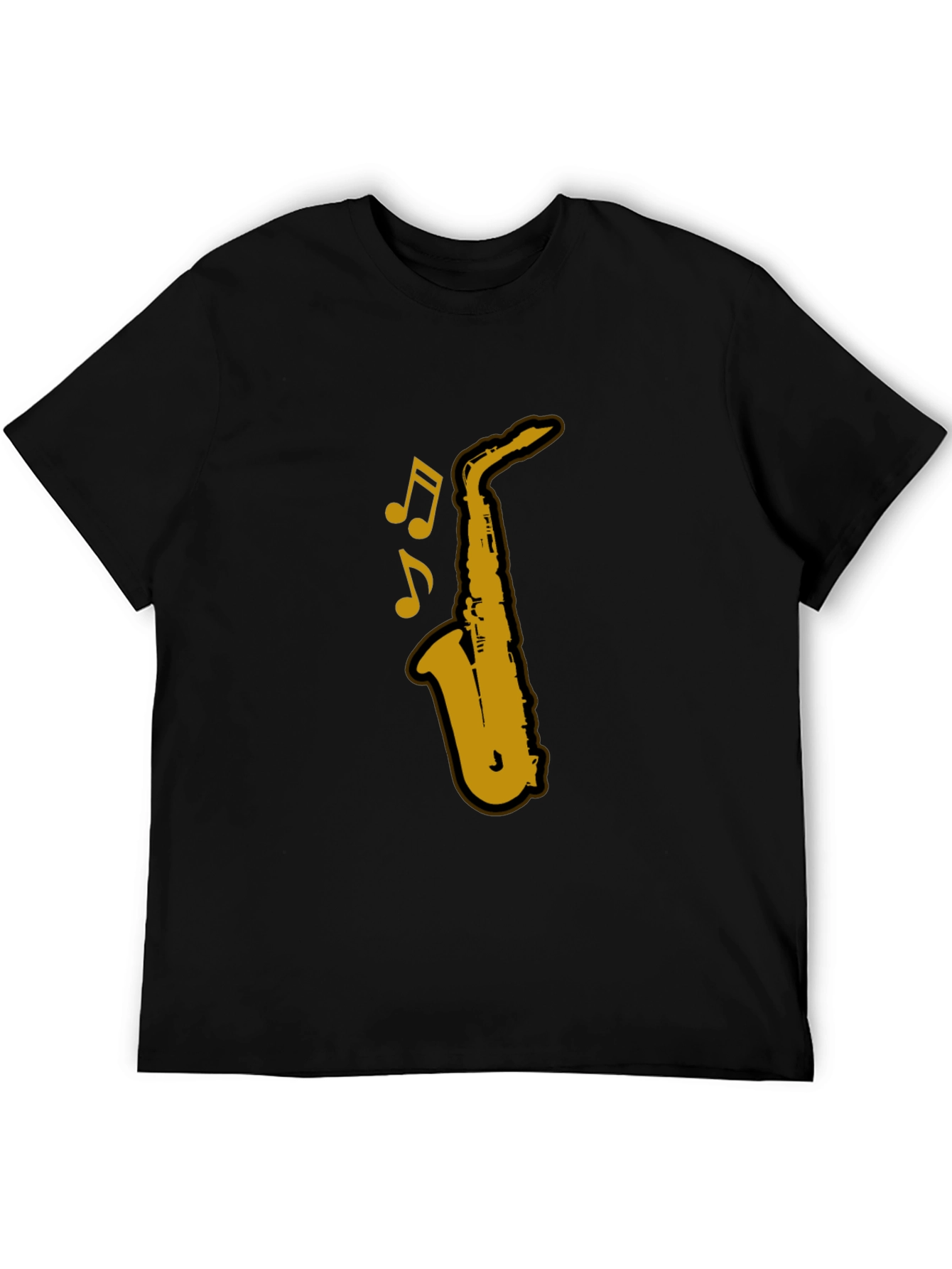Showcase your love for music with this stylish black t-shirt featuring a prominent saxophone graphic. The design includes a golden-colored saxophone with musical notes, creating a musically inclined and fashionable look. Made from what appears to be a comfortable and durable fabric, this t-shirt is perfect for casual wear, music events, or simply expressing your passion for jazz and musical instruments. Its classic fit makes it suitable for everyday use, while the unique design ensures you stand out. Ideal for musicians, music lovers, or anyone who appreciates distinctive apparel. Add a touch of rhythm to your wardrobe!