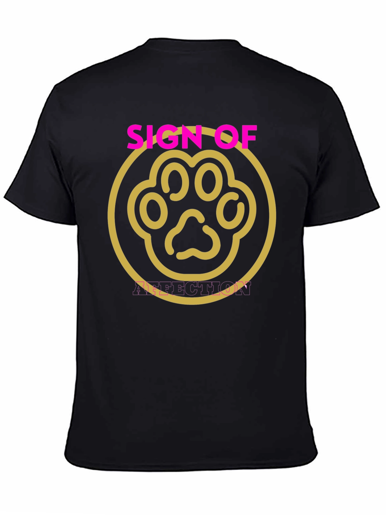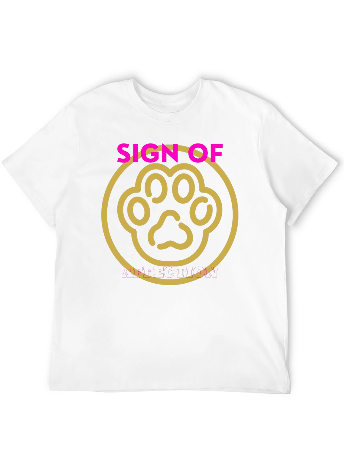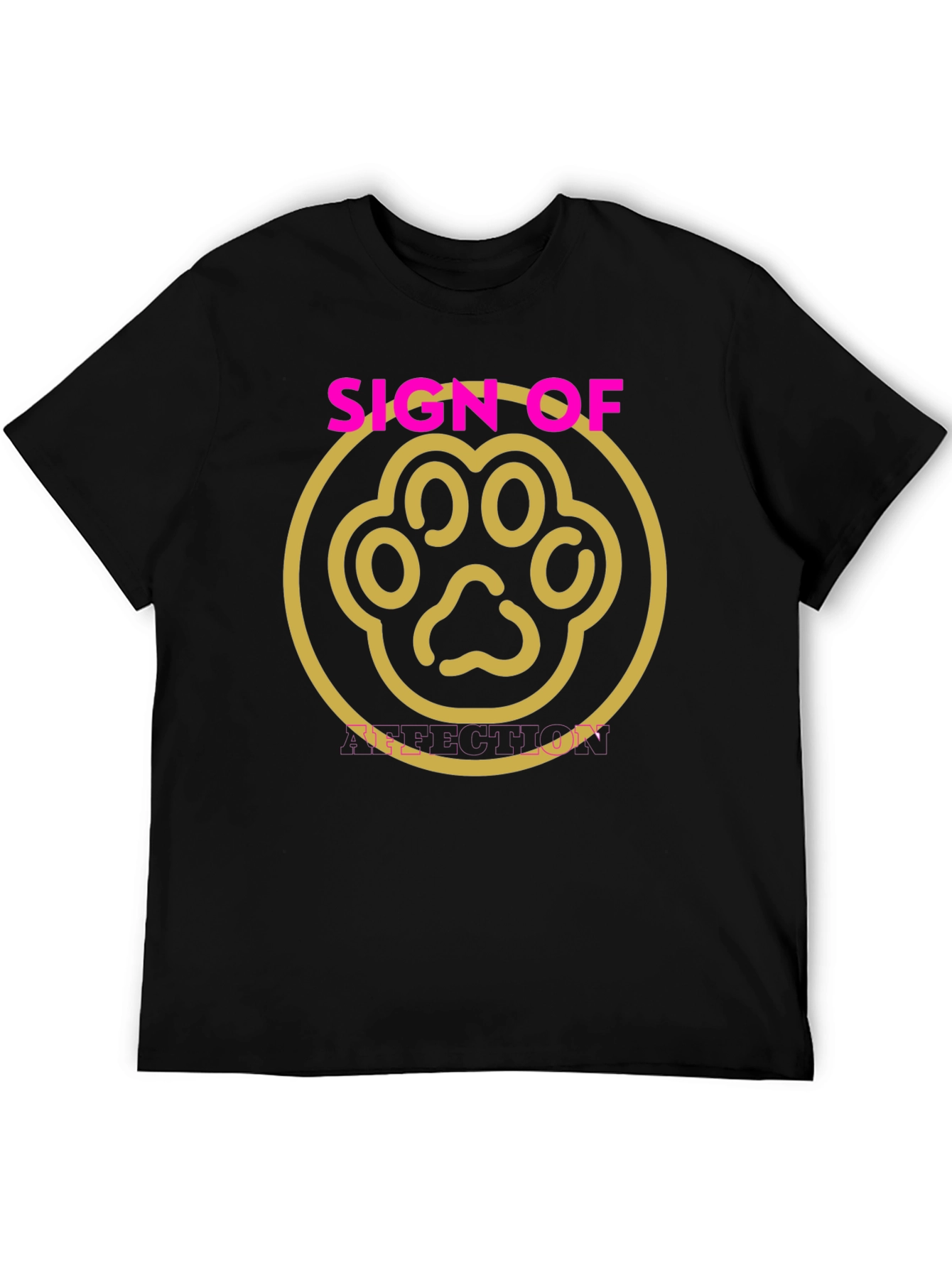 Show your love with this stylish black t-shirt featuring a gold-outlined paw print inside a circle. The words 'SIGN OF' are printed in bright pink above the graphic. This comfortable and eye-catching tee is perfect for animal lovers, pet owners, or anyone who wants to show a little affection. The classic black color makes it versatile to pair with any outfit. Wear it casually or dress it up for a unique statement look. A great gift for a friend or family member who loves their furry companions.