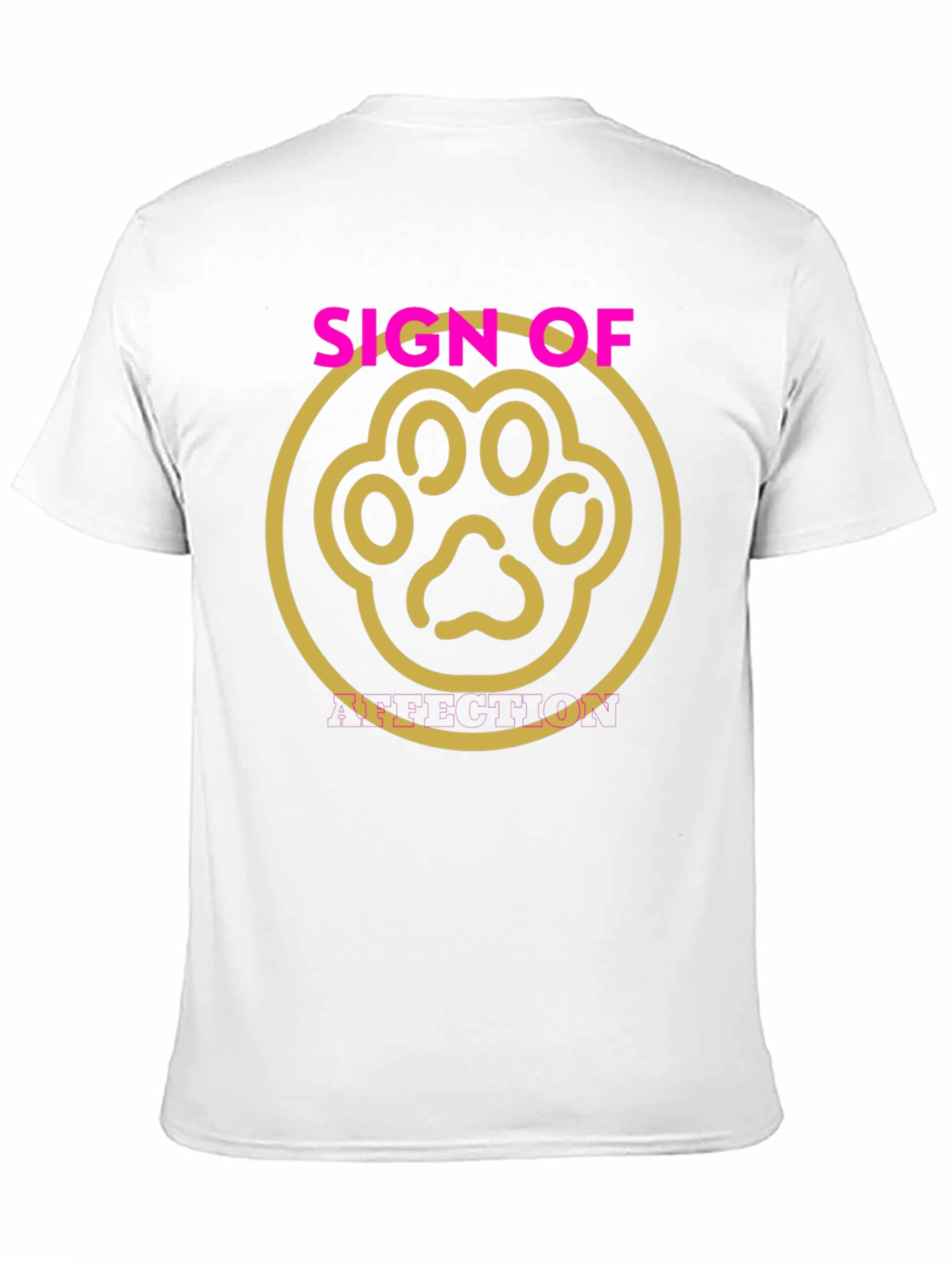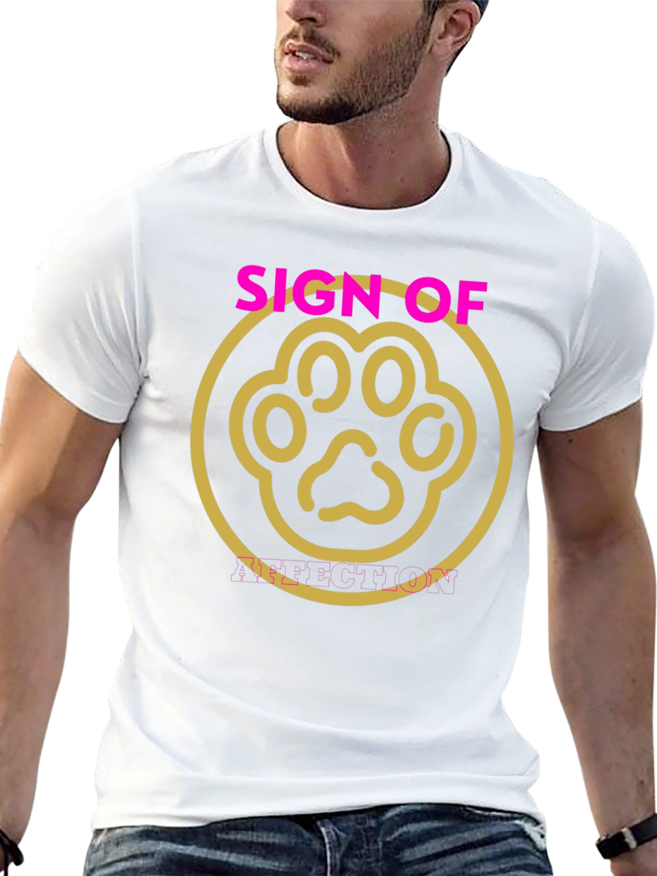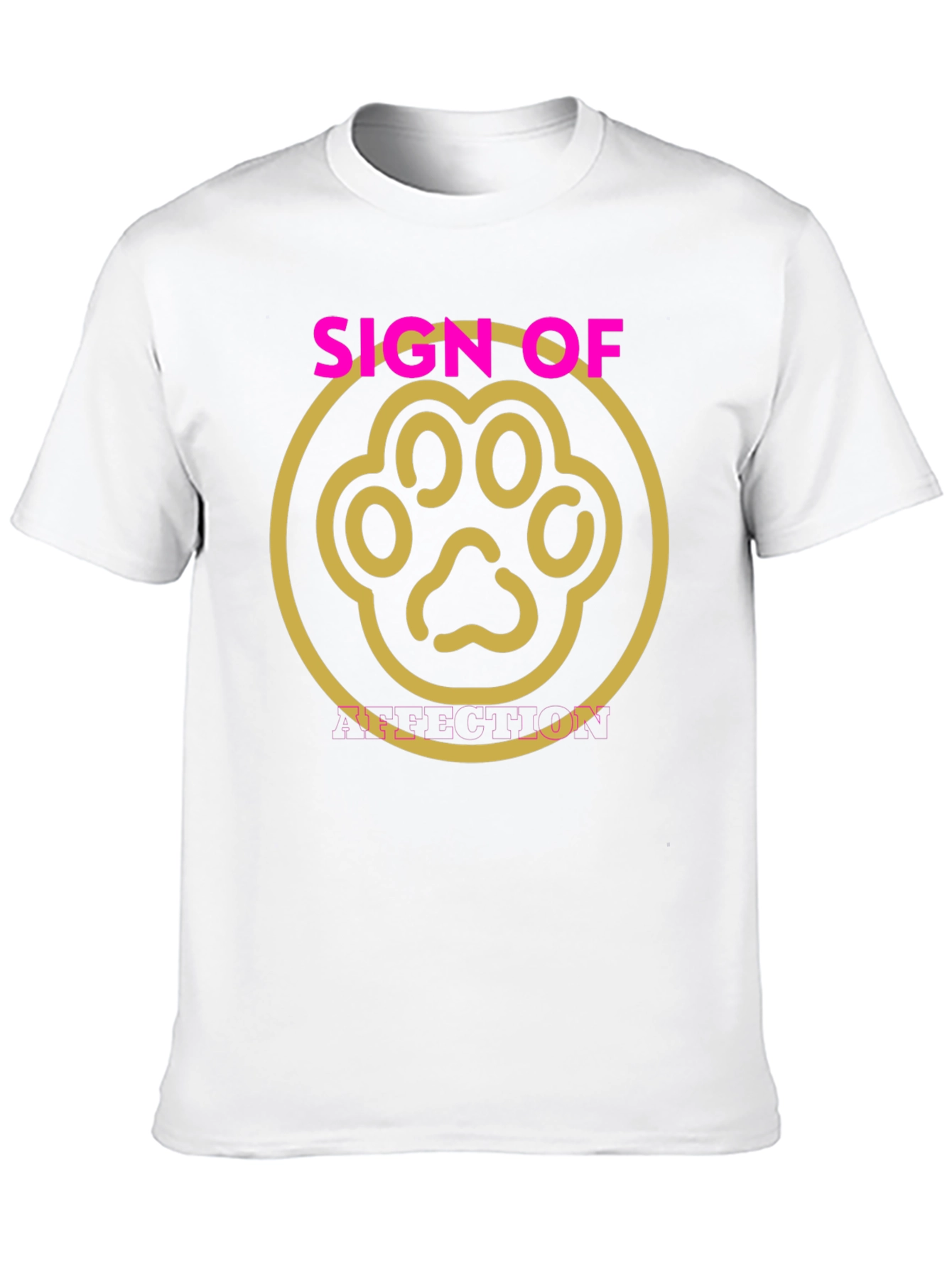 Show your love with this stylish black t-shirt featuring a gold-outlined paw print inside a circle. The words 'SIGN OF' are printed in bright pink above the graphic. This comfortable and eye-catching tee is perfect for animal lovers, pet owners, or anyone who wants to show a little affection. The classic black color makes it versatile to pair with any outfit. Wear it casually or dress it up for a unique statement look. A great gift for a friend or family member who loves their furry companions.