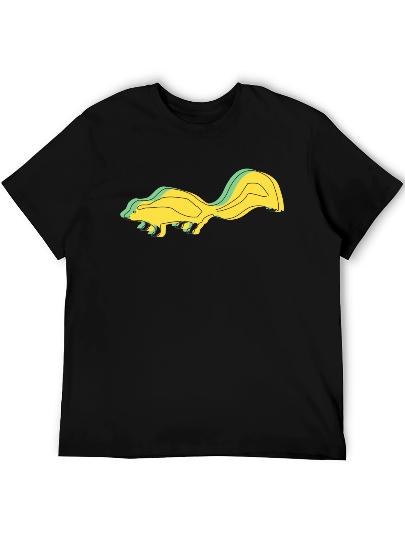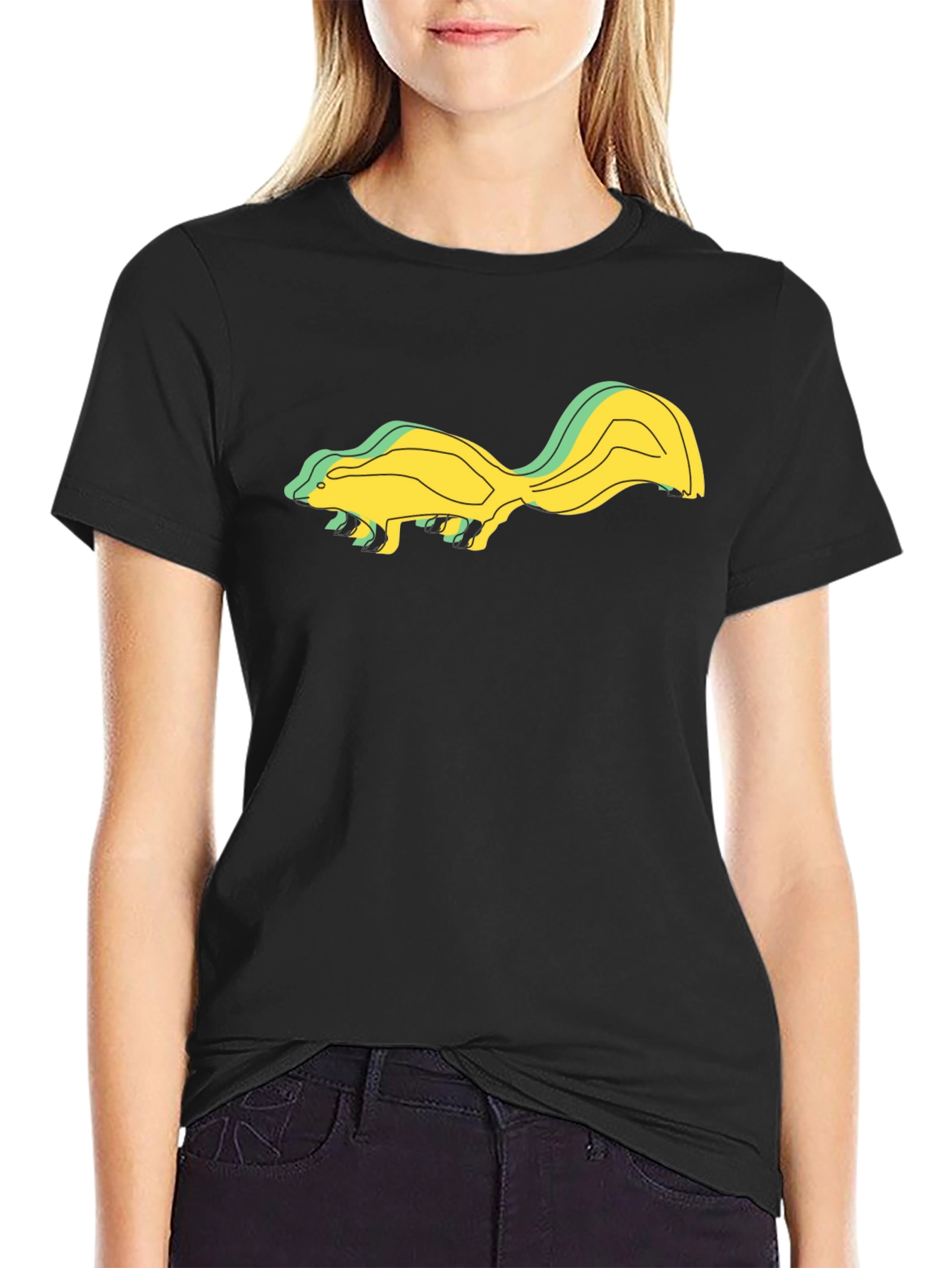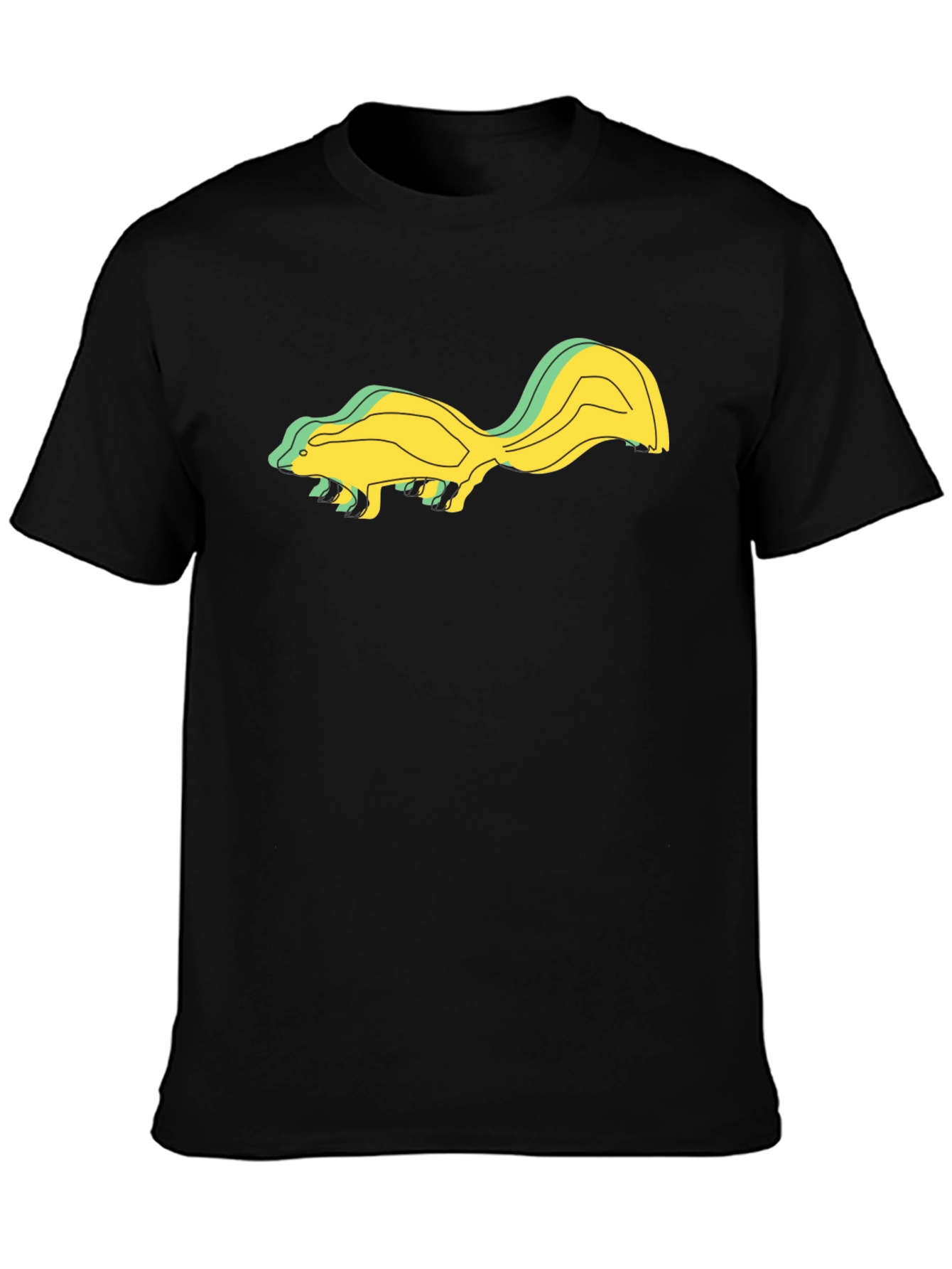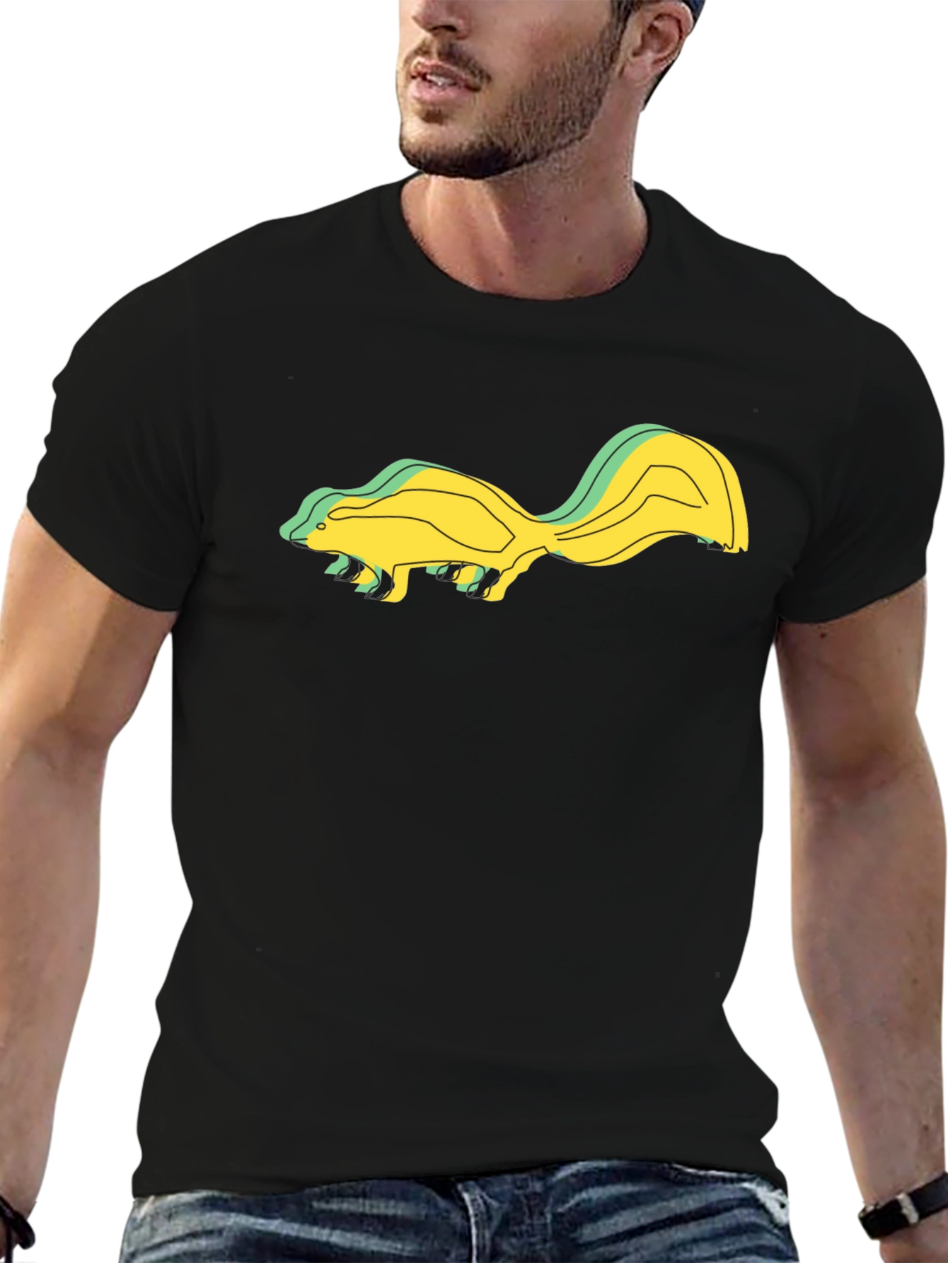 Show off your wild side with this unique skunk graphic t-shirt. The tee features a quirky, stylized skunk design in vibrant yellow and light green, creating a standout visual. Made from a comfortable black cotton blend, this tee offers a classic fit that's perfect for everyday wear. Whether you're making a statement or just adding a touch of fun to your outfit, this skunk tee is sure to impress. Its breathable fabric ensures all-day comfort, making it ideal for casual outings, concerts, or just lounging around. This eye-catching design is perfect for animal lovers and those who appreciate a touch of humor in their wardrobe. A must-have addition for your unique tee collection.