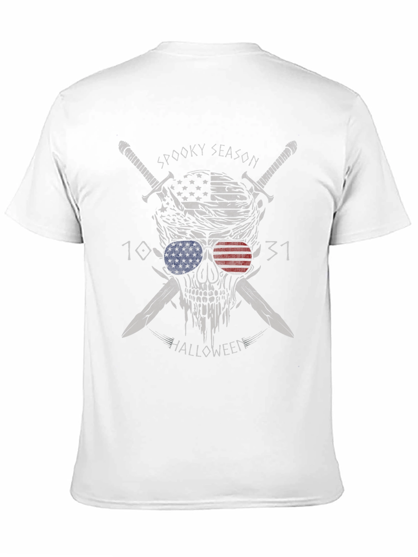 Embrace the spirit of Halloween with this unique graphic tee. Featuring a skull design adorned with American flag-themed elements, including glasses and headwrap, this shirt perfectly blends spooky and patriotic vibes. Crossed swords add a touch of edginess, while the '10' and '31' hints at the Halloween date. The words 'Spooky Season' and 'Halloween' completes the artwork. Made from a comfortable fabric, it's ideal for parties, casual wear, or as a Halloween costume alternative. Show off your love for Halloween with this standout tee!