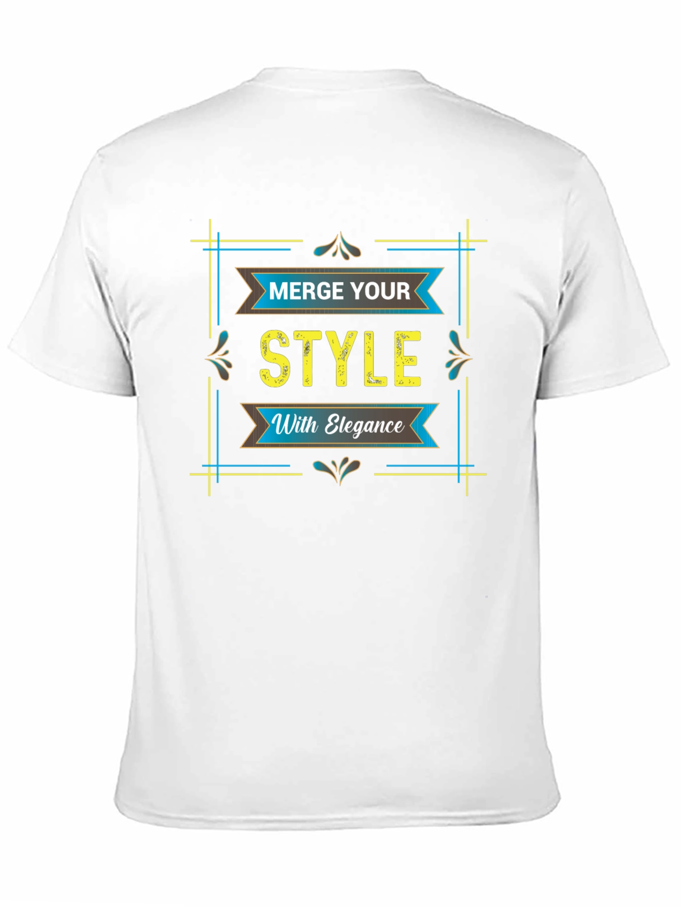 Elevate your casual style with this sophisticated black t-shirt. This tee features a visually appealing graphic design with a blend of turquoise, yellow and brown accents. The design includes the words "Merge Your Style With Elegance" in a creative font. Made from comfortable and breathable material, this t-shirt is perfect for everyday wear. Its versatile style makes it easy to pair with jeans, shorts, or even dress pants for a more polished look. Showcase your unique sense of fashion with this eye-catching tee, suitable for any casual occasion.
