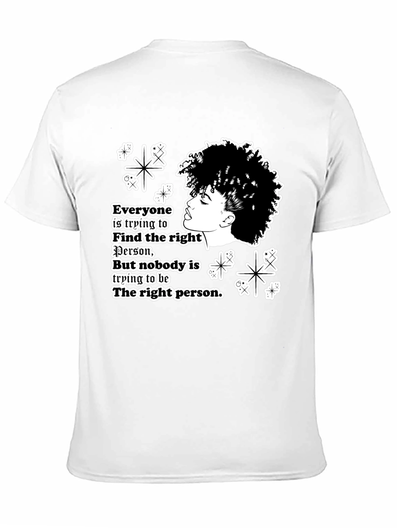This black graphic t-shirt features a striking white design with an inspirational quote about finding the right person. The design also includes a stylish illustration of a woman with a distinct afro hairstyle, surrounded by snowflake-like accents. Made from comfortable material, this tee is perfect for everyday wear. The bold design and message make it a great conversation starter and a fashionable way to express your values. Ideal for casual outings, social gatherings, or as a thoughtful gift. Make a statement with this unique and eye-catching t-shirt!