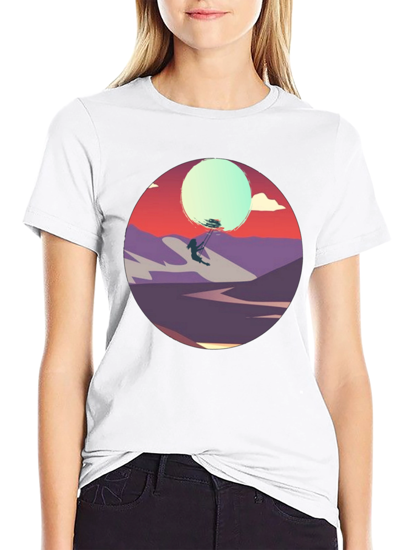Embrace artistic style with this unique graphic t-shirt. The design features a captivating silhouette of a person on a swing against a vibrant sunset backdrop. The circular graphic includes a light green sun, purplish mountains, and orange skies, creating a visually stunning image. Made from a comfortable fabric, this black t-shirt is perfect for casual wear and expressing your individuality. Stand out from the crowd with this statement piece that blends art and fashion seamlessly. Ideal for everyday wear or as a thoughtful gift for art lovers.