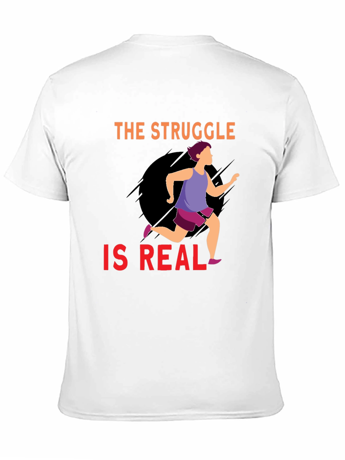 Embrace the challenge with this unique "The Struggle Is Real" t-shirt. Made from comfortable, breathable fabric, this black tee features a vibrant design of a runner, capturing the essence of perseverance. The bold text adds a touch of humor and motivation, making it perfect for workouts, casual wear, or as a gift for the running enthusiast in your life. Show off your dedication and inspire others with this stylish and relatable shirt.