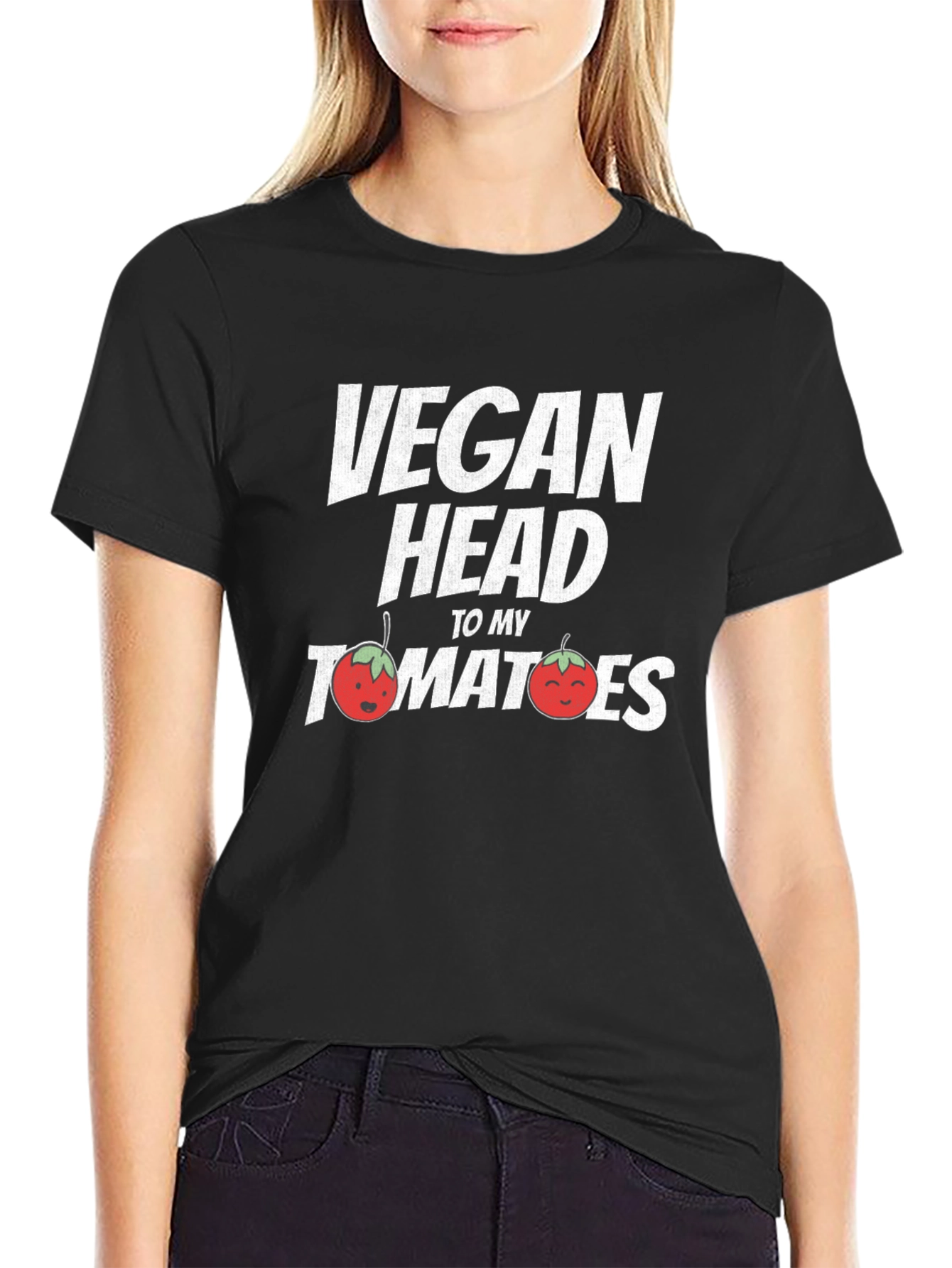 Show off your playful vegan side with this eye-catching graphic tee. The shirt features a bold, white "Vegan Head To My Tomatoes" design across the chest, punctuated by two cartoon tomatoes with happy faces. Made from a comfortable, black fabric, this tee is perfect for casual wear. Its light weight and breathable material make it ideal for everyday wear. Whether you're hitting the farmer's market or hanging out with friends, this shirt is sure to spark conversation and show your love for plant-based living. Embrace your love for healthy eating and tomatoes!