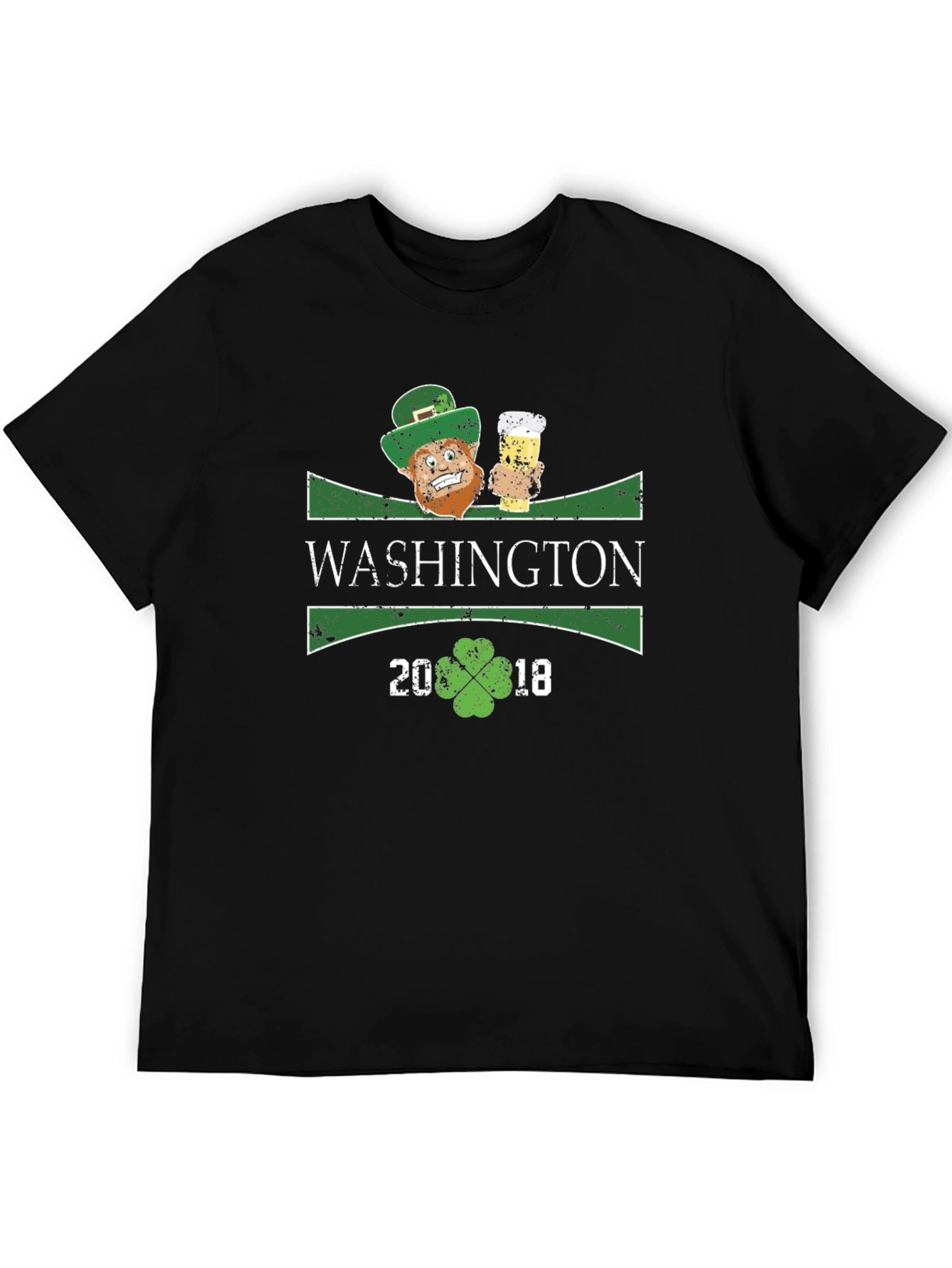 Celebrate St. Patrick's Day in style with this unique Washington graphic tee. The black t-shirt features a festive design with a leprechaun, beer, shamrock, and "Washington 2018" print in green and white. Made from soft, breathable cotton, this tee offers all-day comfort. The distressed print adds a vintage touch to the design. Perfect for St. Patrick's Day parades, parties, or casual everyday wear to show your Irish pride. Great for locals and fans of Washington state alike! This fun and stylish t-shirt is sure to turn heads and spread the holiday cheer.