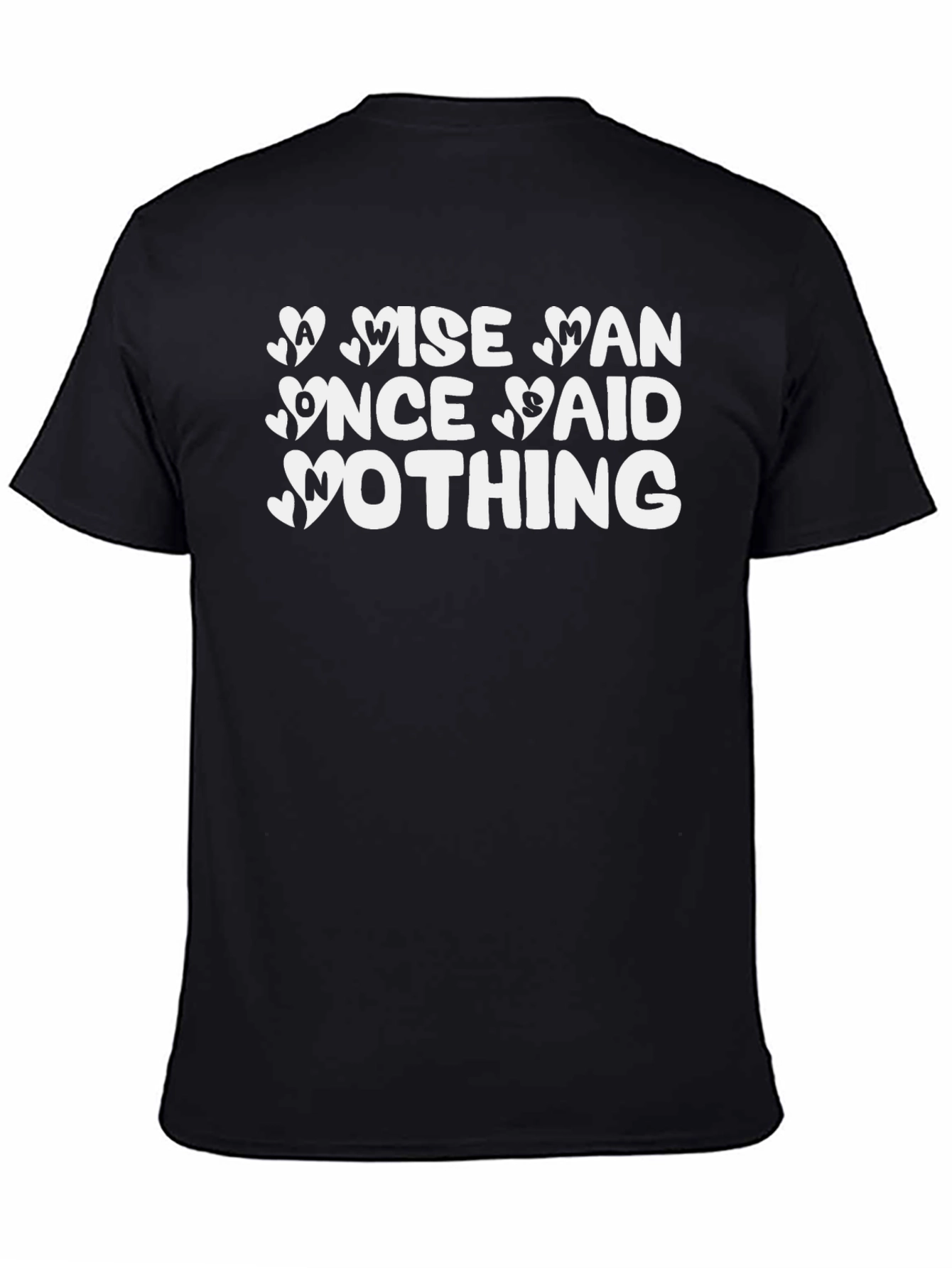 Embrace understated wisdom with this eye-catching black t-shirt. The shirt features a bold, stylized graphic that reads "A Wise Man Once Said Nothing", with heart accents adding a touch of whimsy. The print is crisp white, creating a striking contrast against the dark background, ensuring the message pops. Made from what appears to be soft, breathable fabric, this tee is ideal for casual wear. The classic fit looks comfortable and flattering on most body types. Perfect for everyday wear, expressing your unique sense of humor, or as a conversation starter.