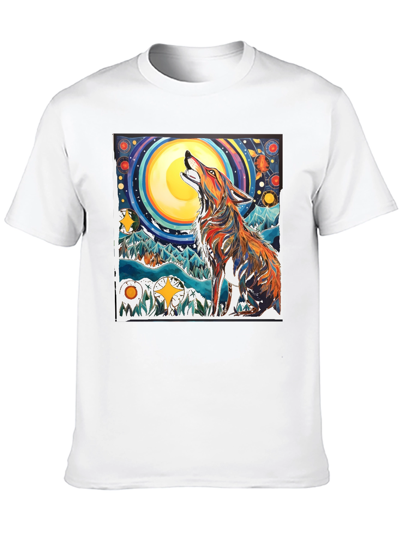 This black t-shirt features a vibrant and detailed graphic of a wolf howling at a full moon, set against a backdrop of stylized mountains and celestial designs. The artwork is rich in color and intricate detail, making it a standout piece. Made from what appears to be a soft and comfortable cotton blend, this tee offers both style and ease. Perfect for casual wear, outdoor adventures, or as a unique gift for animal lovers and art enthusiasts. Dress it up or down for a versatile look. The high-quality print ensures lasting vibrancy, wash after wash.
