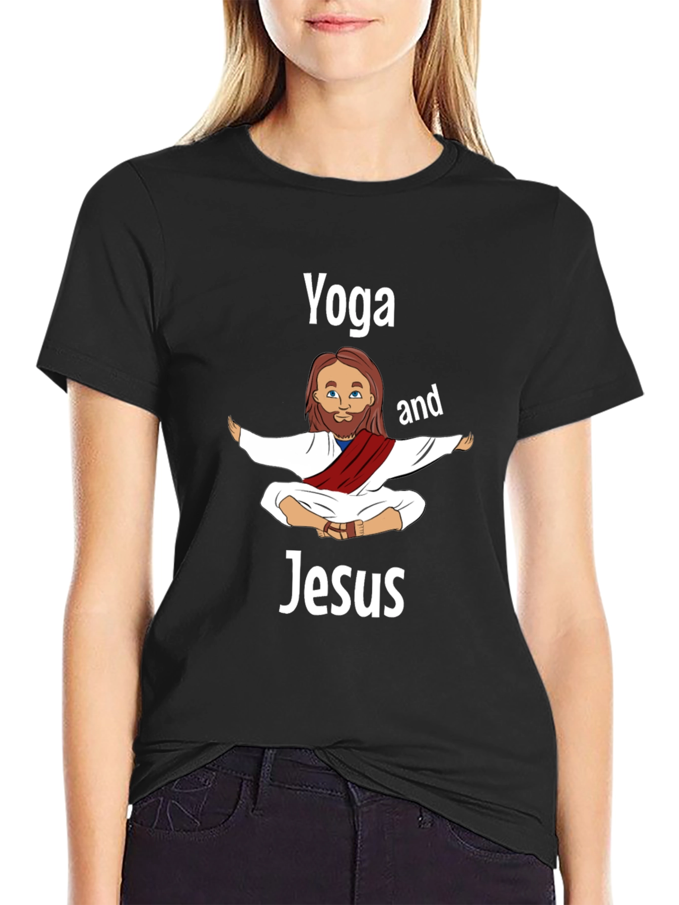 Embrace spiritual wellness with this unique black t-shirt! Featuring a playful cartoon graphic of Jesus in a yoga pose, accompanied by the words "Yoga and Jesus", this tee combines faith and fitness in a fun way. The design is printed prominently on the front of a classic fit, short-sleeved black shirt. Made from what appears to be a comfortable cotton blend, this shirt is perfect for casual wear, yoga classes, or as a conversation starter. A great gift for those who love yoga and have a sense of humor!