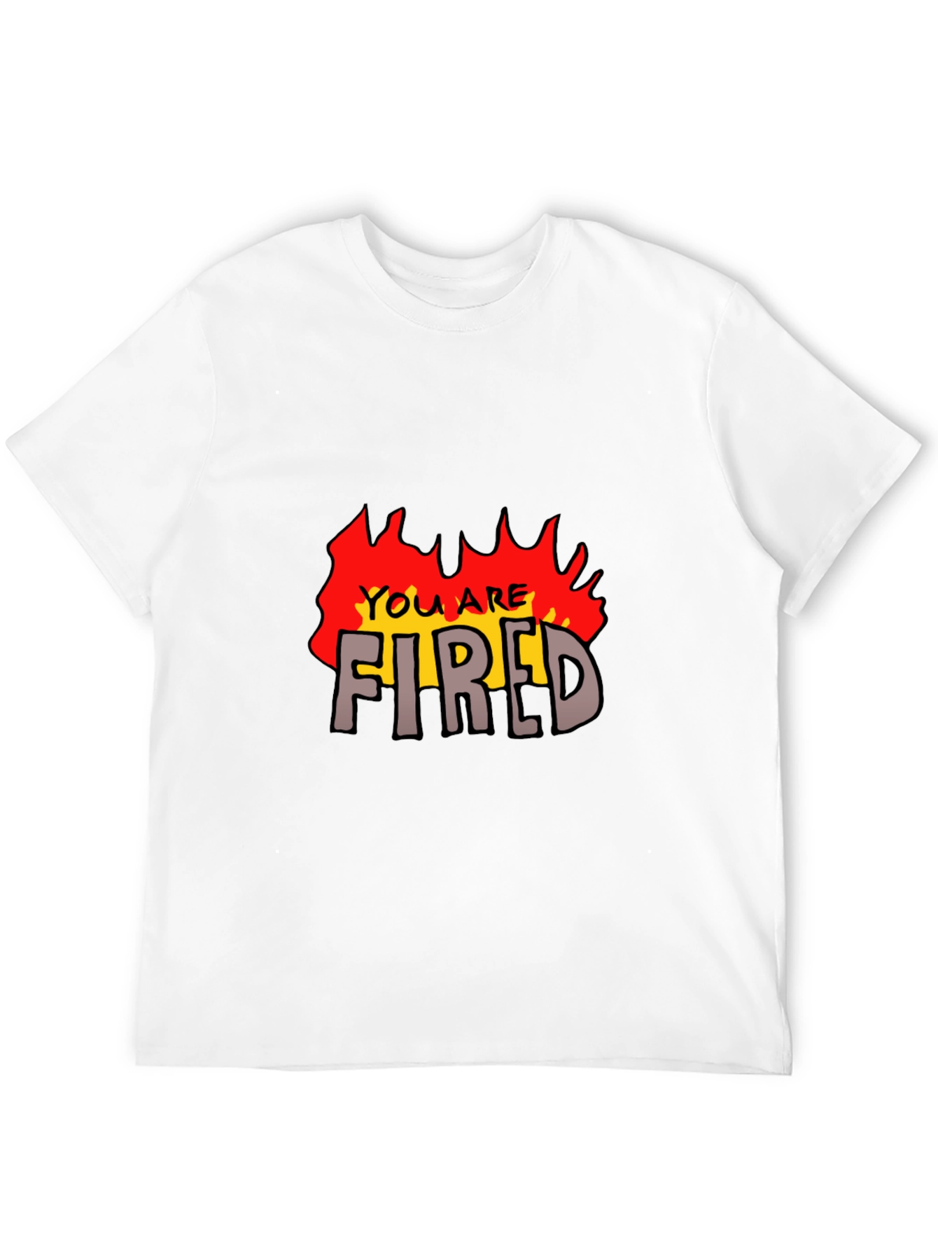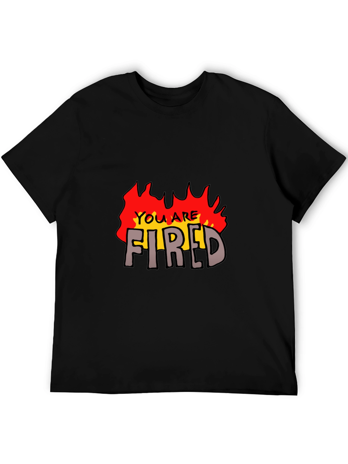 Make a statement with this bold and humorous black t-shirt. This eye-catching tee features a cartoonish, vibrant "You Are Fired" graphic surrounded by fiery red and yellow flames. The design is prominently displayed on the front, ensuring maximum impact. Crafted from a soft, comfortable fabric, this shirt is perfect for casual wear, adding a touch of edgy humor to your everyday style. Wear it to parties, casual gatherings, or anytime you want to make a memorable impression. Express yourself with this unique and expressive tee!